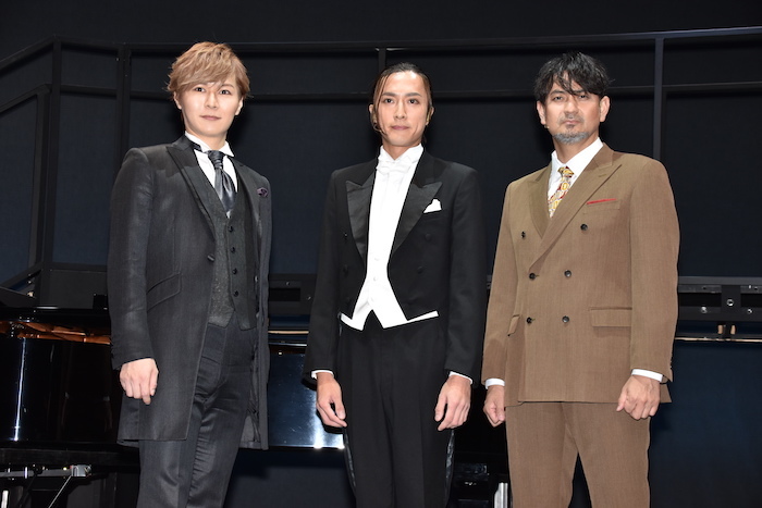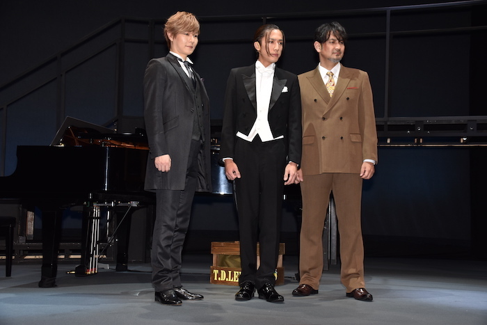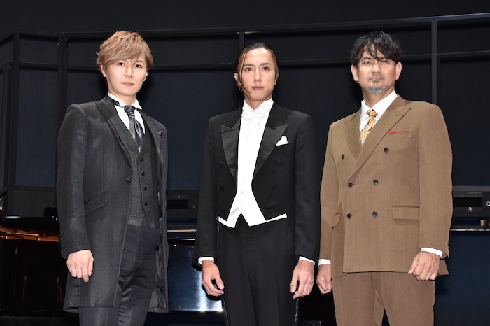 音楽劇『海の上のピアニスト』が2021年9月16日(木)から東京芸術劇場シアターイーストほかで開幕する。初日を前にした15日(水)、ゲネプロ(総通し舞台稽古)と記者会見が行われ、出演者の内博貴、藤本隆宏、ピアノ演奏の西尾周祐が作品への意気込みを語った。