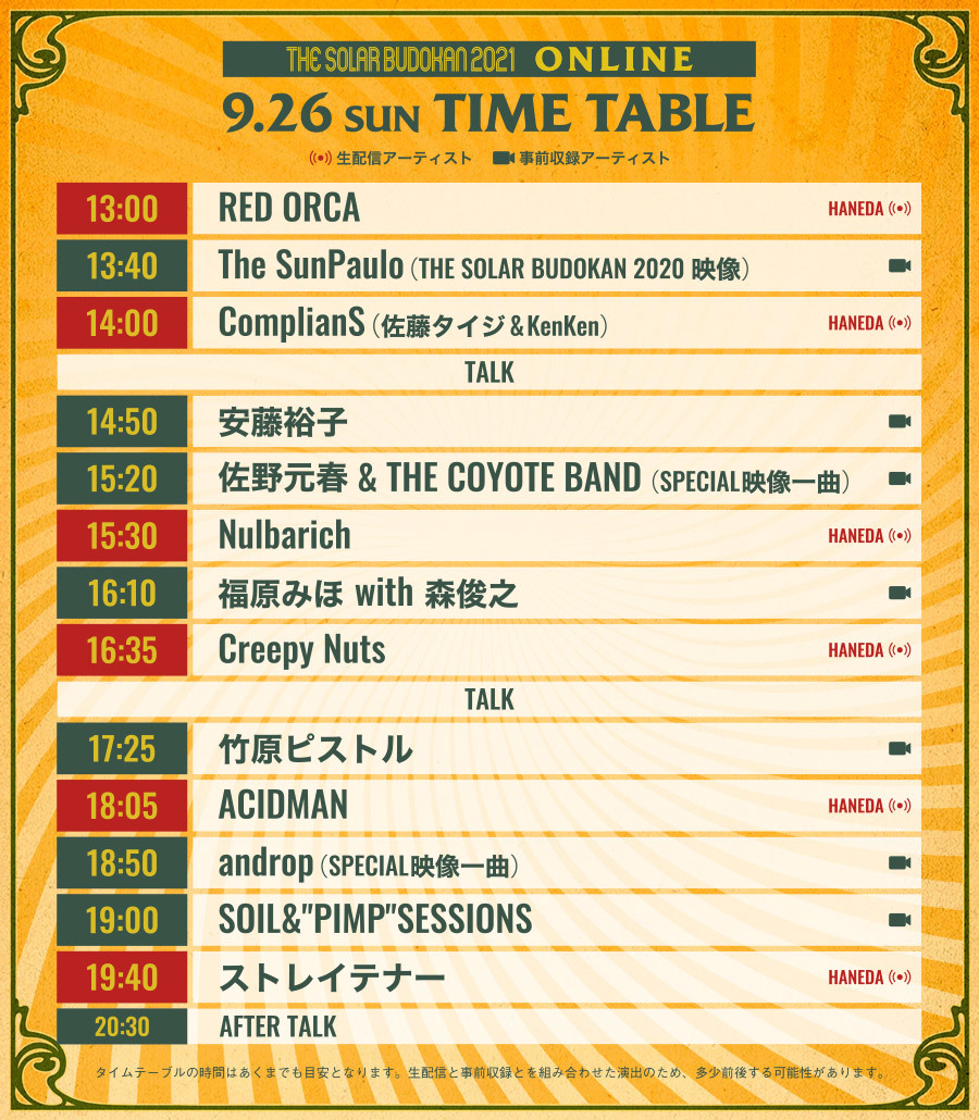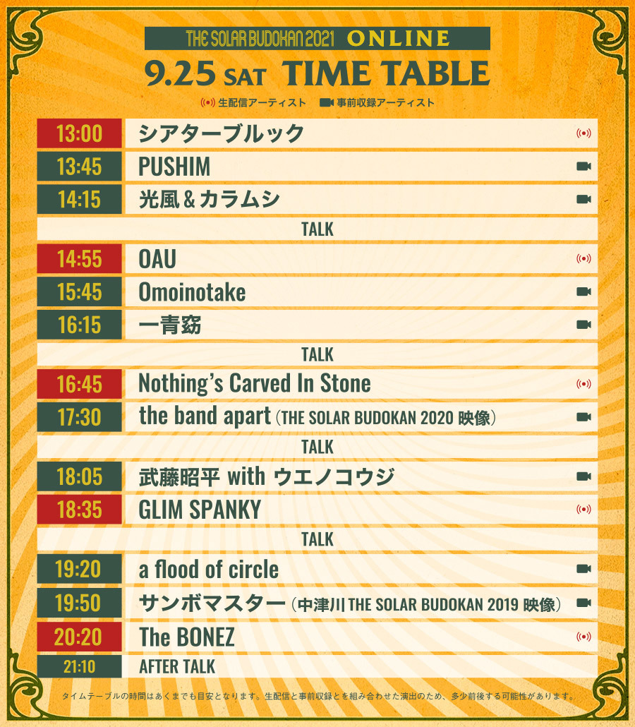 太陽光発電のエネルギーを活用した配信ロックフェスとして9月25日(土)26日(日)に開催される『THE SOLAR BUDOKAN 2021 ONLINE』のタイムテーブルが発表された。