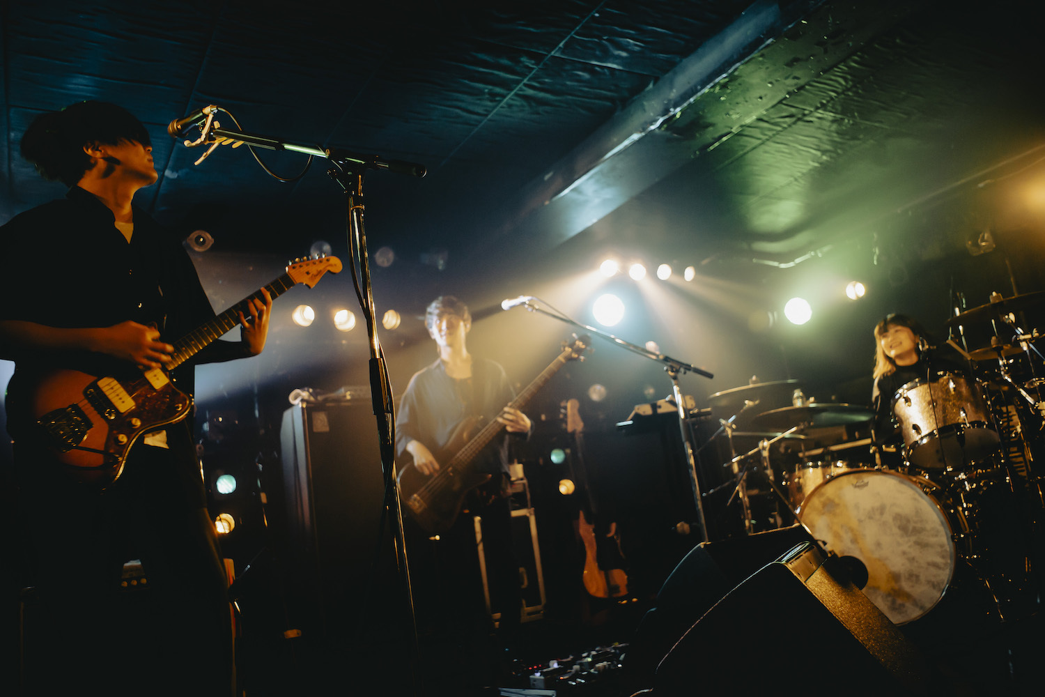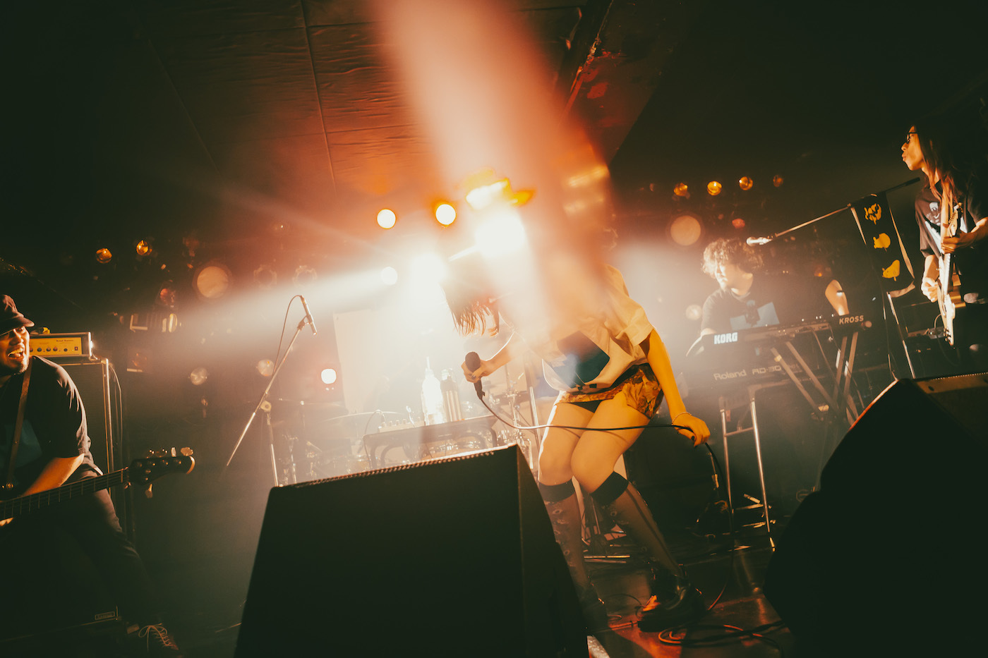 “下北沢だいちゅき♡”と筆で書かれた半紙を掲げた後、セツコがマイクスタンドの前に立つと、ドラムが4カウント。1曲目は「運命開花」だ。駆け抜けていくバンドサウンドの上で、ときに激情的に声を張り上げながら歌うセツコ。歌い出しからかなり集中して曲の世界に入り込んでいる。初日公演のときは、序盤はやや固さがあって、この日も後のMCで「最終日で緊張している」と話していたのだが、その印象は皆無。いきなりトップギアで、力強いロングトーンを伸び伸びと轟かせた。「空白ごっこです」と落ち着いた声で挨拶をした後、続けてアップテンポの「ストロボ」へ。クラップをしたり拳をあげたりと、フロアの熱を力強く牽引しながら歌を届けていく。