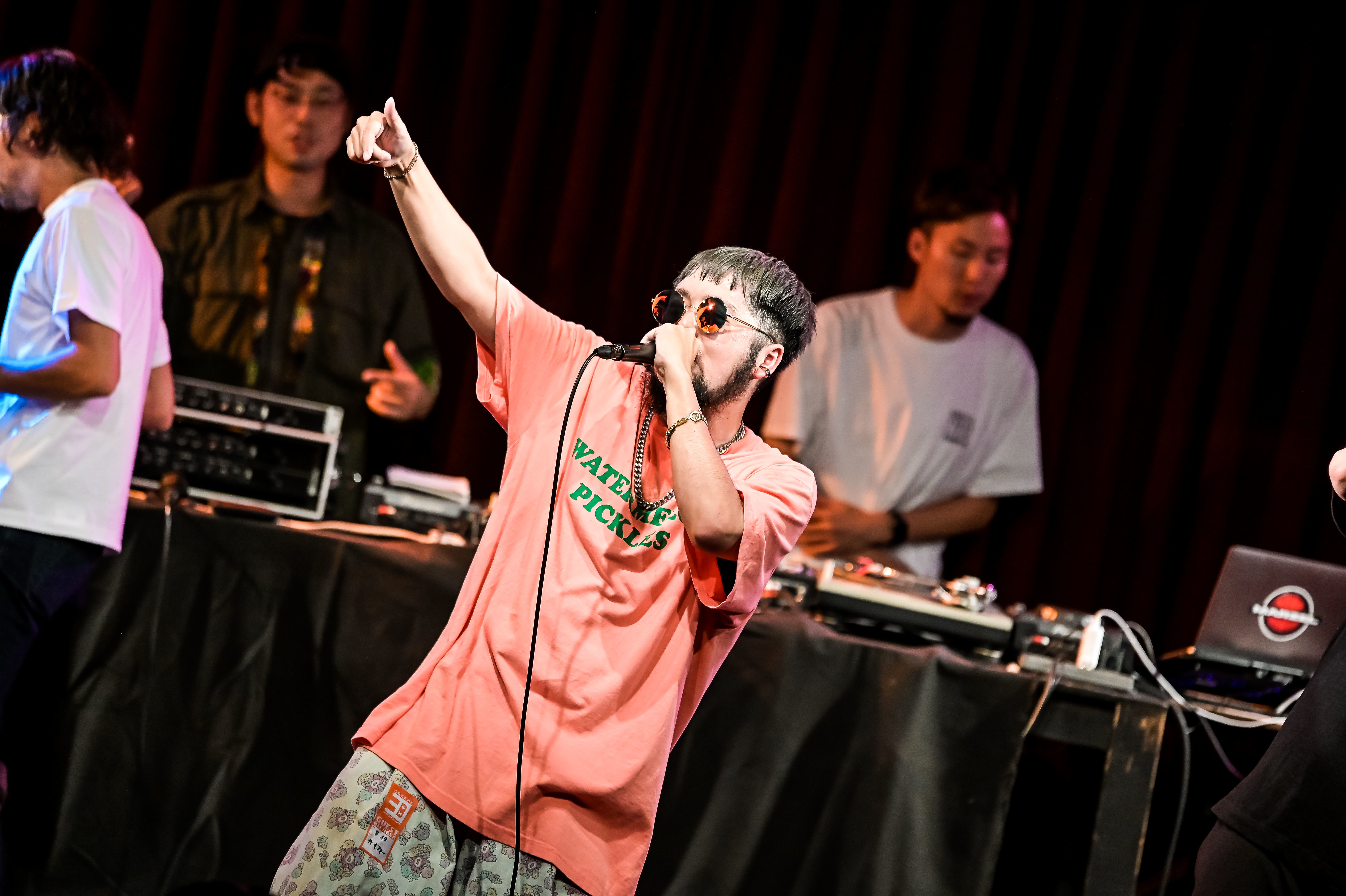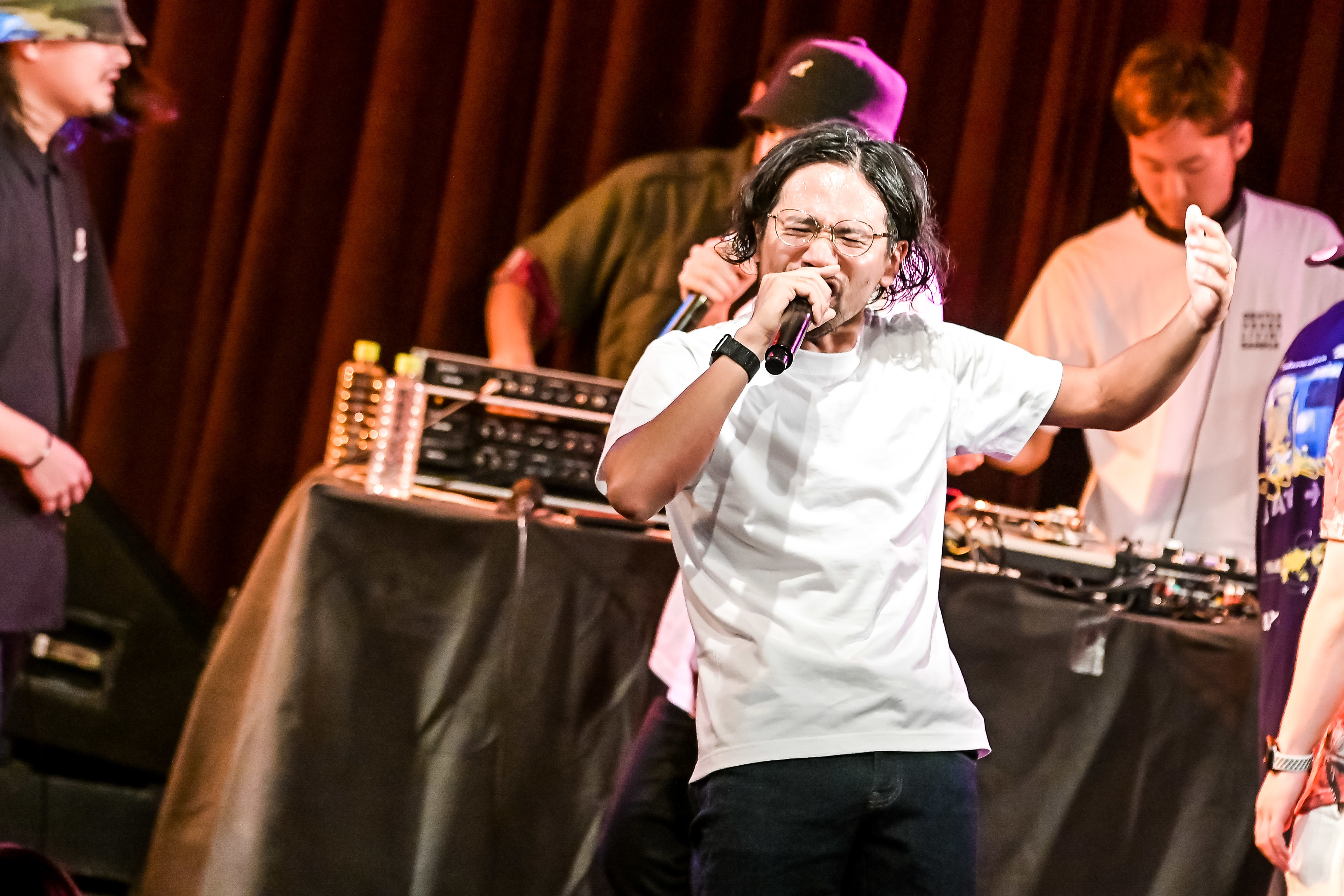 そんな感謝を述べた後は、「メンタルが10代やったらどんなことも乗り越えられるヒップホップのマッチョソング」(KZ)と再び切り出し、テークエムとR-指定のナビゲートから「無敵ライクセブンティーン」へ。目まぐるしく主役と見せ場が変わる展開で、一瞬たりとも飽きさせることなく引き込んでいく。メンバー全員の足が地に着く瞬間がないほどに飛び跳ね、「急かされるのはゴメンだぜ」でも、人数も言葉数も刺激も興奮も、全ての感情の物量作戦で根こそぎ見る者のハートを奪っていく梅田サイファー。「この空間だけは、全部忘れてマジでハイになりましょう!」(R-指定)との宣言通り、「マジでハイ」ではマジで灰になりそうなぐらいの燃え上がるハンズアップで、Shangri-Laをとことん亜熱帯化。
