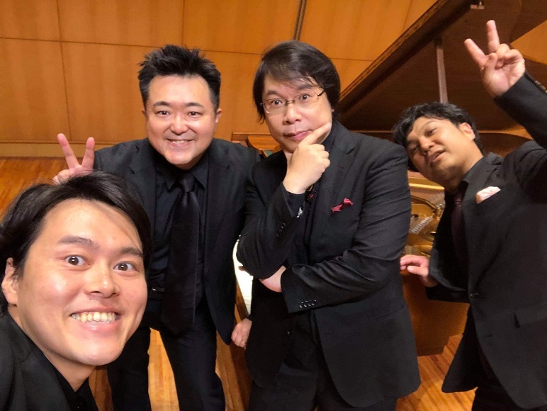 びわ湖ホール声楽アンサンブルソロ登録メンバーと。 山本康寛、指揮者 園田隆一郎、竹内直紀、二塚直紀(左より)「スタンウェイ”ピノ”シリーズ」より(2019年びわ湖ホール小ホール)
