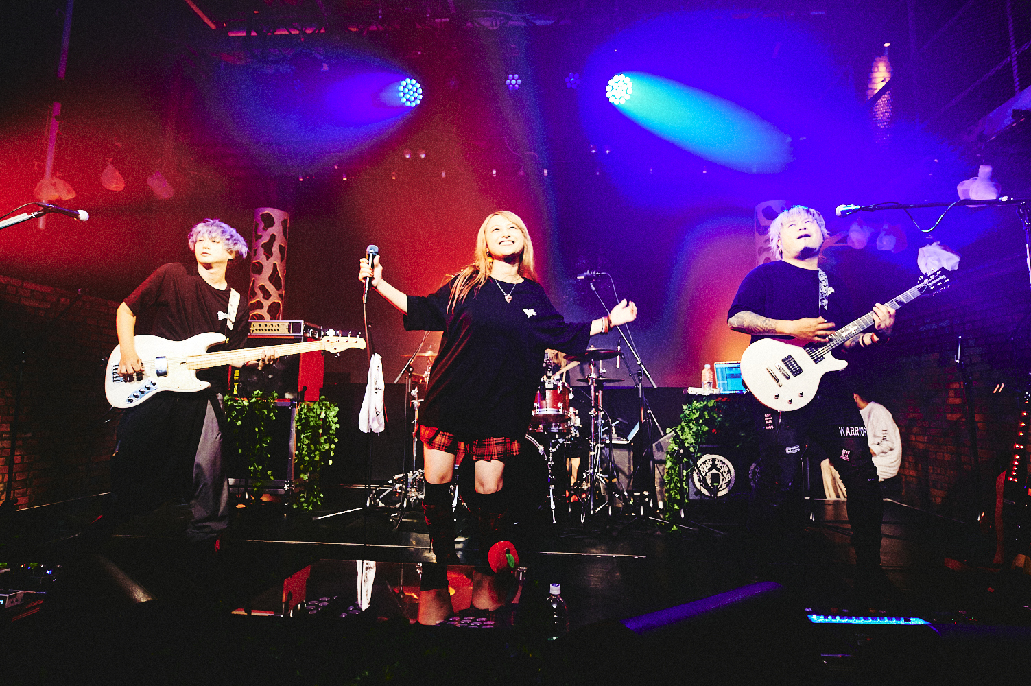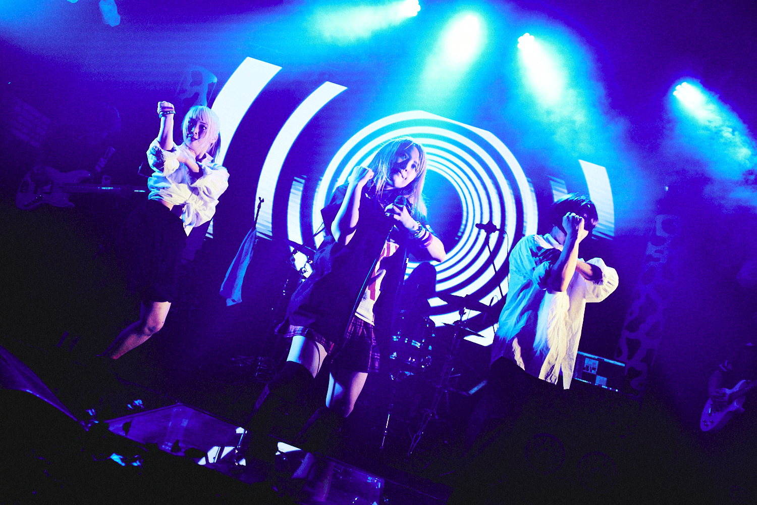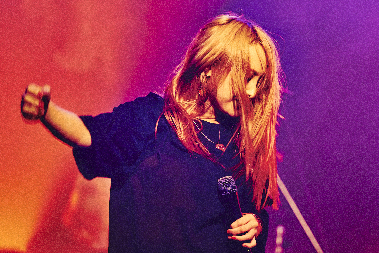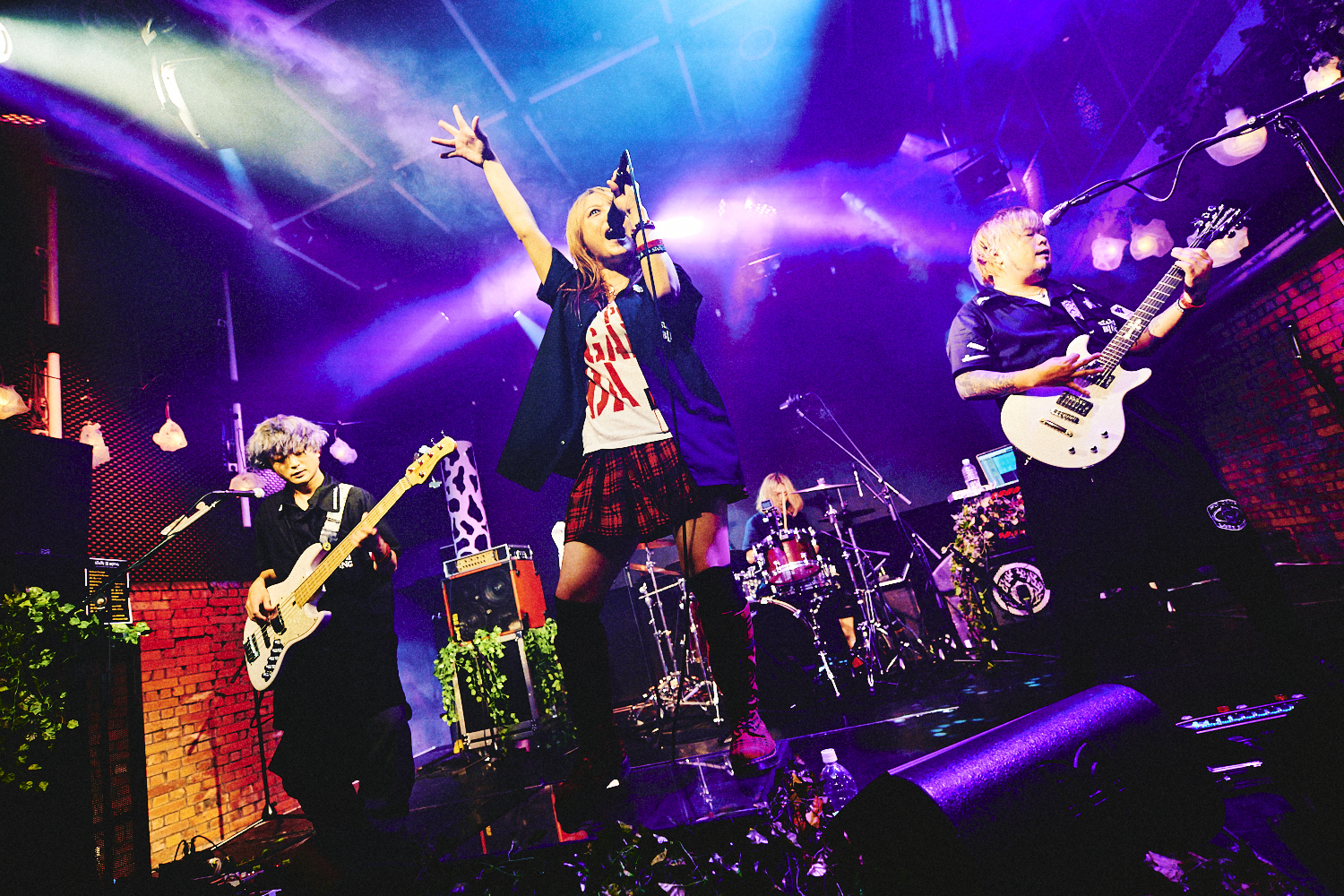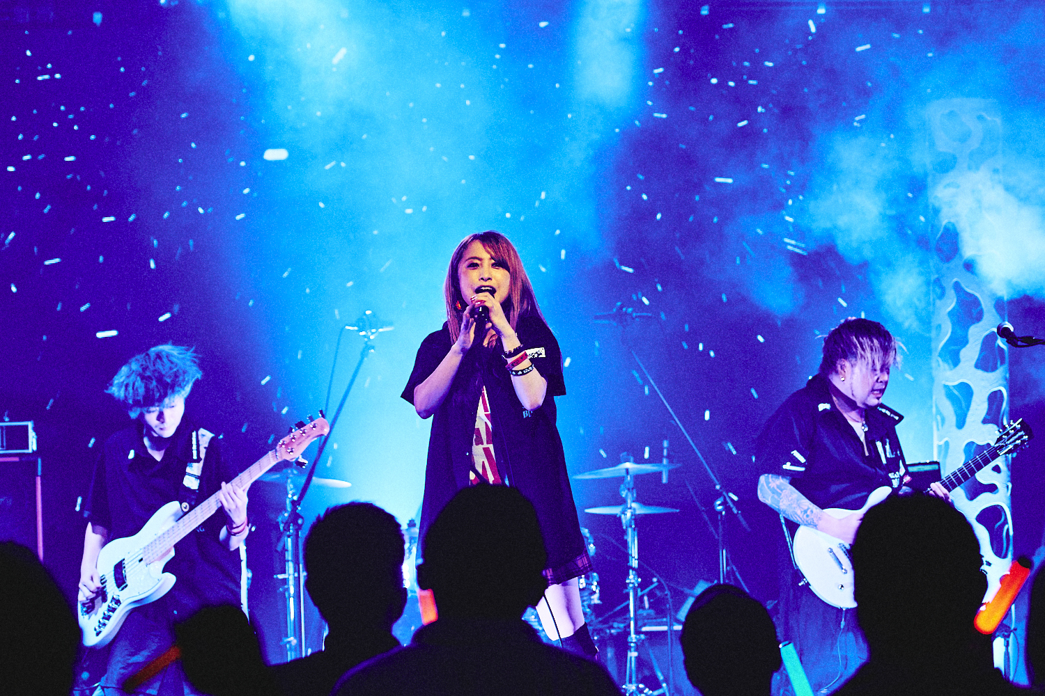 バンドロゴの入ったタオルを高々と掲げ、満面の笑顔で登場した茉莉奈は、パンキッシュな赤黒のミニスカートにブーツ、そしてメンバーとお揃いの黒のワークシャツ。ブロンドの毛先をピンクに染めたセミロングのヘア、噂通りのパワフルボイスを響かせ、小柄ながらもダイナマイトなボディで飛び跳ねる姿は、ひとことで言えば「華がある」。スクリーンに炎が燃え盛るかっこいいオープニング映像から、インスト曲「S.T.B」を皮切りに「Break The Shell」「Shout It To My Face」とファストチューンをたたみかけるアグレッシヴな展開に、フロアを埋めたオーディエンスはクラップで応戦。緊急事態宣言下、キャパシティ制限がありつつもソールドアウトしたこのライブ、ステージの上も下も気合の入り方が半端ない。