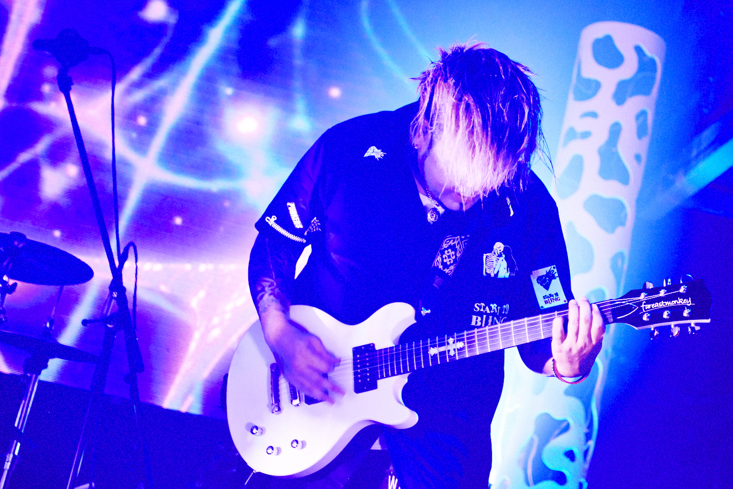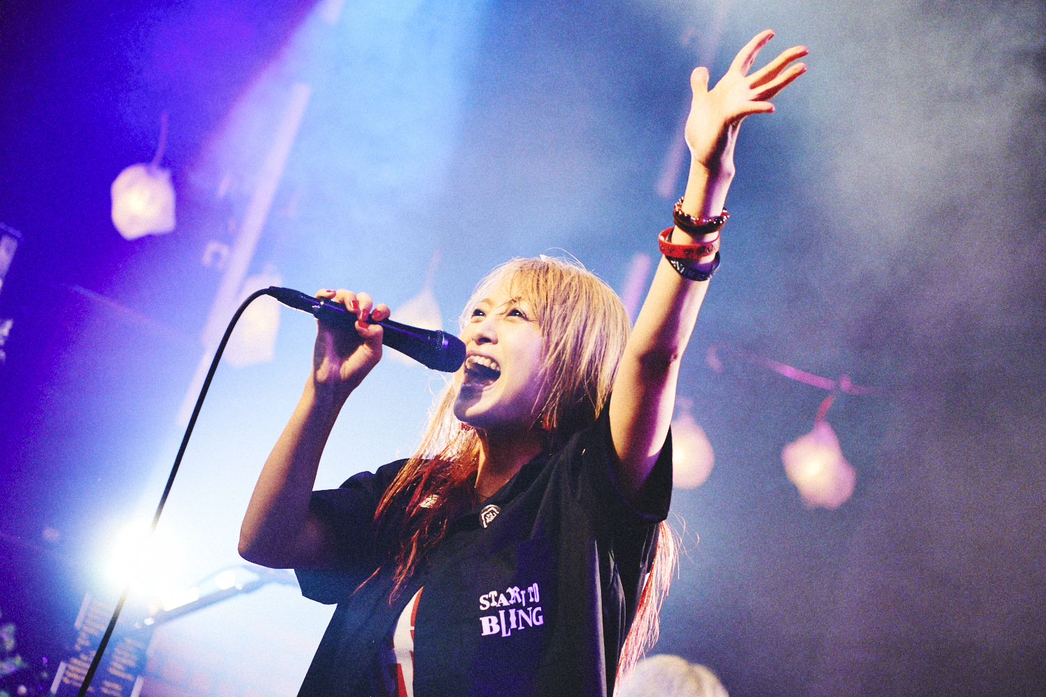 前半のハイライトは、『RE:BOOT』からのメロディックチューン「千年コントラクト」で決まりだろう。蛍のような粉雪のような銀河のような、まばゆい光の粒が舞うスクリーンの映像と、幻想的にステージを照らすランタンの灯を背景に、スローでメランコリックなイントロ、疾走するエイトビート、ヘヴィメタルなブレイクダウン、エモいギターソロを経てクライマックスに至る、ドラマチックな5分間。からの、4ビートを効かせた軽快な曲調の「RUMBLING」へ、楽曲のバリエーションは予想以上に広い。私たちが歌って演奏すればSTART TO BLINGになる。言わずとも伝わる、強い意志。