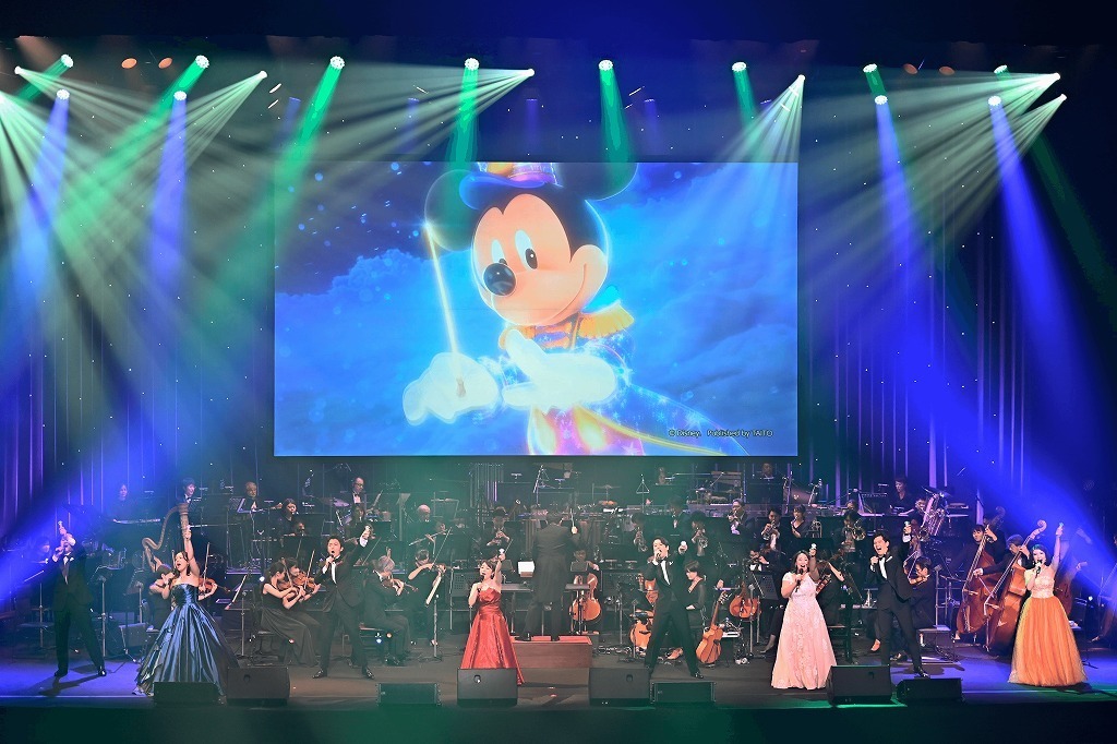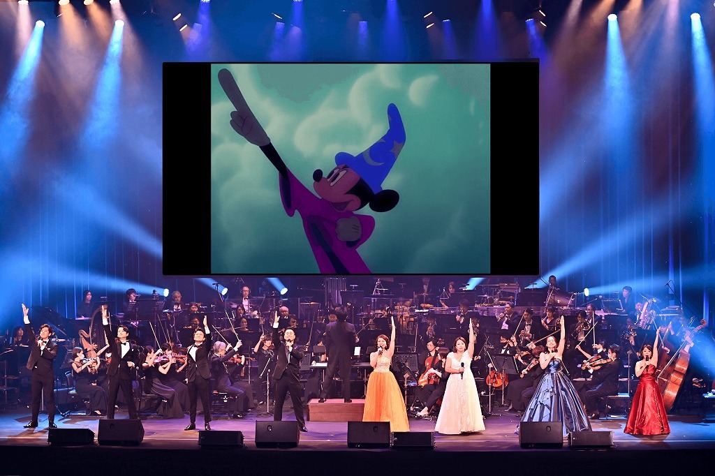 オーケストラ・ジャパンの演奏が始まると、舞台に設置された巨大スクリーンに指揮者に扮したミッキーマウスが映し出された。タクトを振ると、五線譜でできた線路の上をト音記号のマークを付けた汽車が滑り出していく。星が輝く宇宙空間を自在に駆け抜ける列車。ディズニーの魔法の世界の始まりだ。