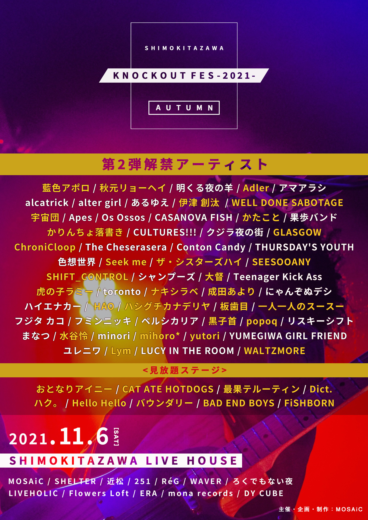 『KNOCKOUT FES』は、2015年に初開催し今回で11度目。音楽の街下北沢に、ライブハウスを根城に活動しているバンド・アーティストが一堂に集結する。会場は主催のMOSAiCの他に、SHELTER、近松、251、ReG、WAVER、ろくでもない夜、LIVEHOLIC、Flowers Loft、ERA、mona records、DY CUBEの計12会場同時開催となる。チケットはイープラスにて発売中。出演者第3弾発表は、10月上旬を予定している。