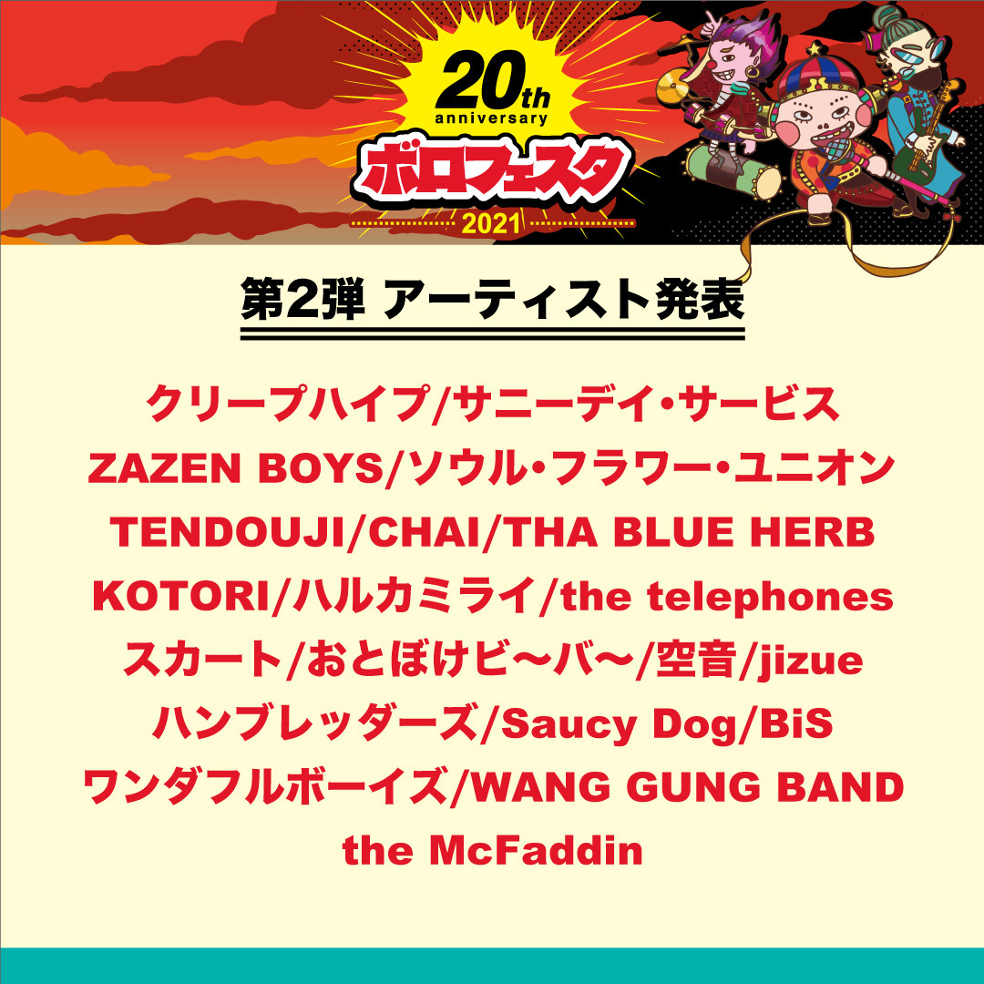 今回の第二弾発表では、過去のボロフェスタでトリを務めたクリープハイプやTENDOUJI、ZAZEN BOYS、活動再開後初めてボロフェスタで演奏するthe telephones、そしてKOTORI、ハルカミライ、ハンブレッダーズ、Saucy Dog、CHAI、THA BLUE HERBと、注目アーティスト20組が集結。初の2週連続開催に向けてますます加速していく。