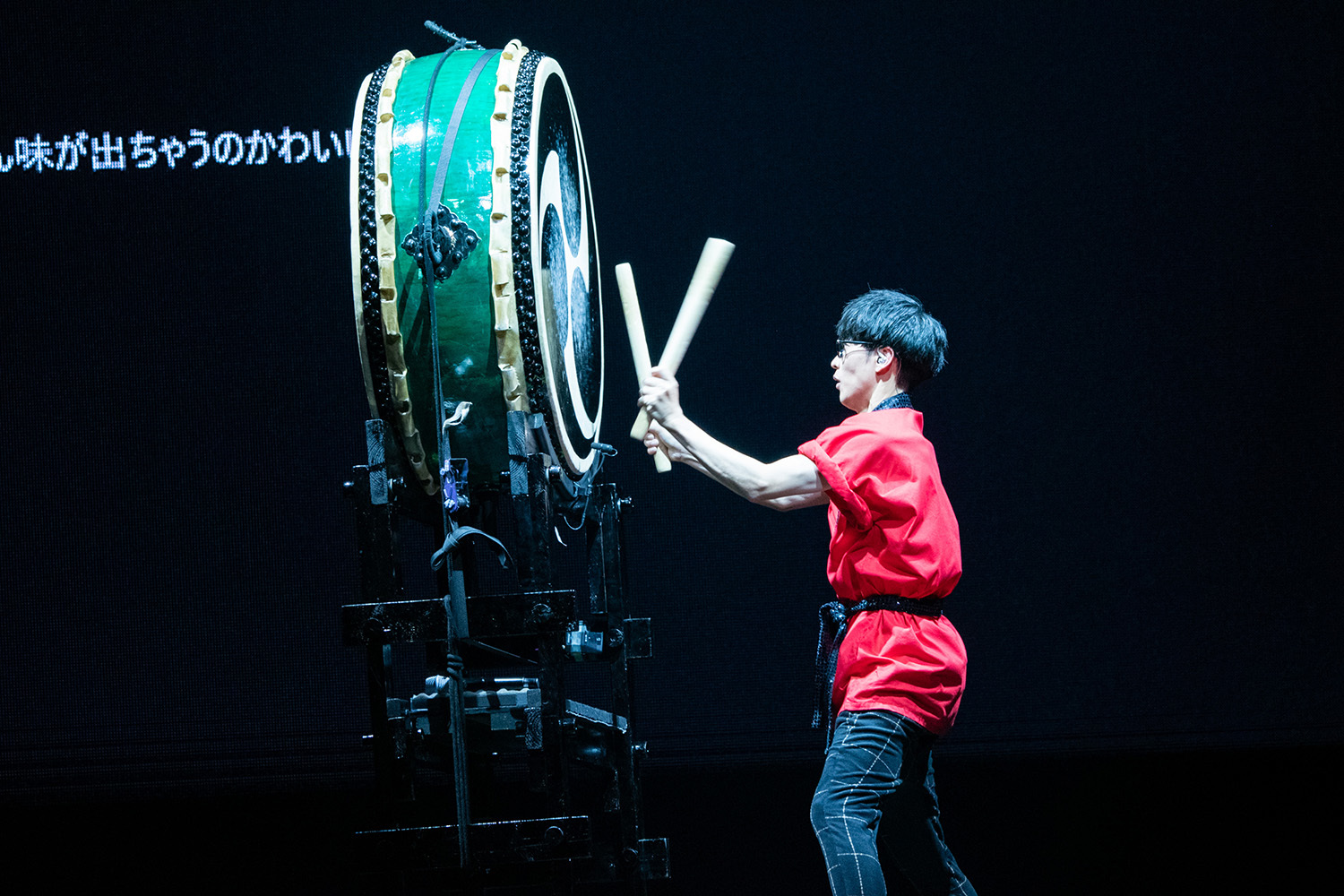 グッズの紹介を挟んで、「みなさん、きっとお待ちかねでしょう。あの曲やりたいと思います」という前フリから「ドラゴンエネルギー」(「オーイシ×加藤のニコ生☆音楽王」テーマソング)へ。アルバム『エンターテイナー』のCDにのみボーナストラックで収録されている楽曲で、アスキーアートの顔文字が現れて番組の前口上を述べる様子に、オーイシがLEDを指差して爆笑する一幕も。歌い終えると、間髪入れずに「ようこそジャパリパークへ」(「けものフレンズ」OPテーマ、作詞・作編曲)がスタート。歌詞をアレンジしたり、間奏で「僕は仮歌が得意なフレンズの、オーイシおにいさんだよ」と自己紹介するなどの遊びを加えながら、最後の1曲を歌い上げた。