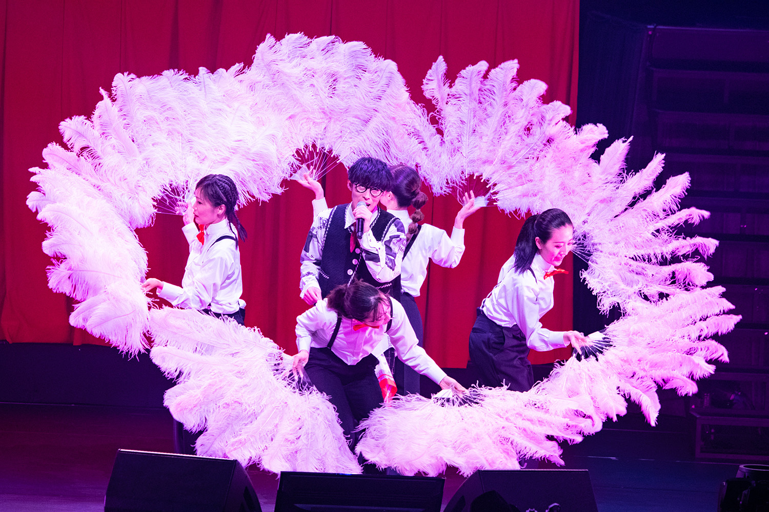 暗転した会場で客席からの大きな拍手と、LEDにコメントでのアンコールが流れる。再び照明がつくとアレンジした物販Tシャツに着替えたオーイシが登場。アンコール1曲目は、演者と観客のコール&レスポンスが醍醐味の「学園天国」(メンズ5 with T.Mが歌唱したドラマ「ファイブ」エンディングテーマ、編曲:大石昌良)。発声ができないなかでも、客席からはペンライトや拳をあげてしっかりとオーイシの呼びかけに答えていた。