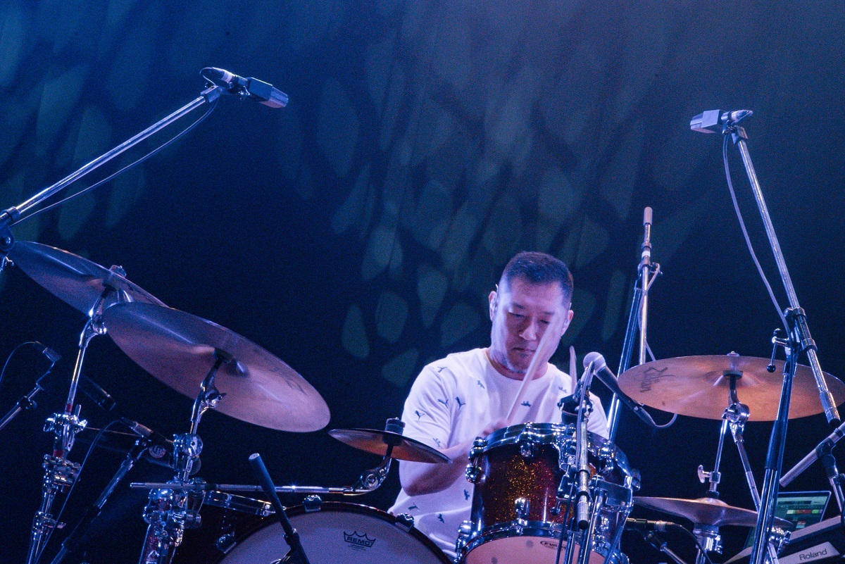 そして、その田中をはじめ、メンバーたちがそれぞれにセッティングを終え、演奏を始める準備が整うと、金戸覚(Ba)がベースをぶんぶんと唸らせながらリフを奏ではじめた。1曲目は5月にリリースした最新アルバム『新しい果実』の6曲目に収録されているロックナンバー「阿」。