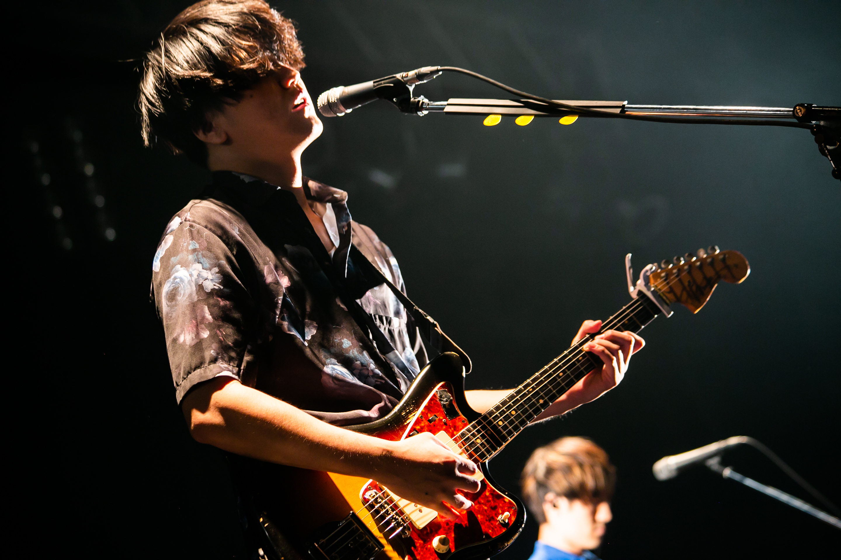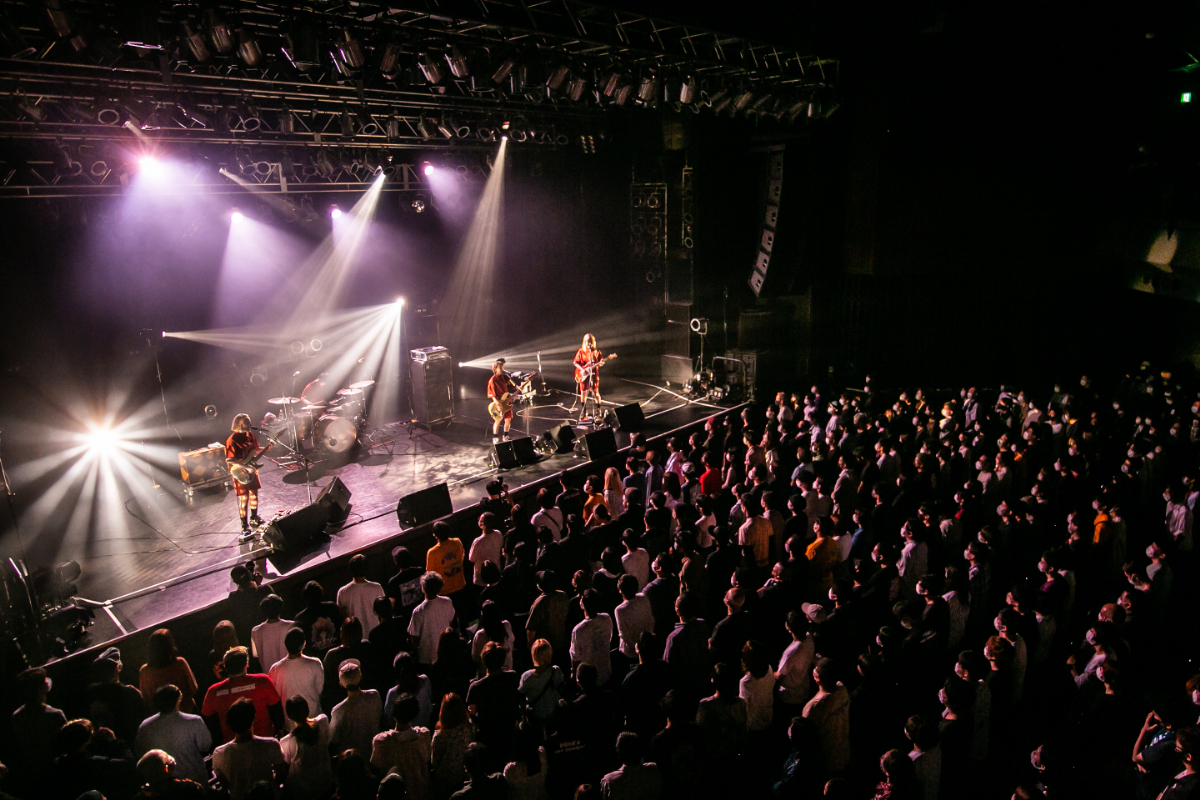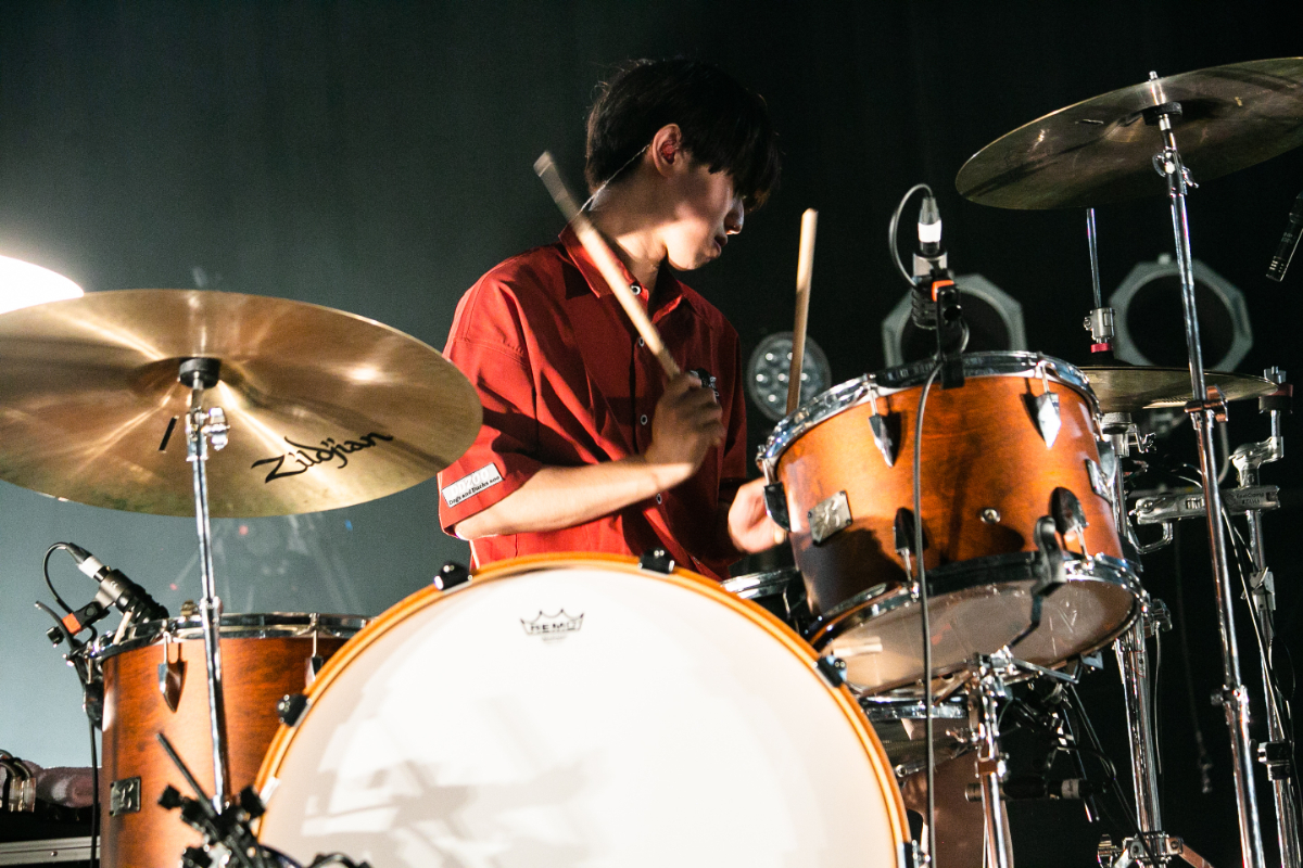 中盤では、メロディアスな「サマーナイトタウン」や「右脳左脳」、キダ モティフォ(Gt/Cho)のカッティングギターが疾走感をもたらす「WARP」をプレイ。さらに中嶋が「今日でうちの犬が、うちに来て2年になるんです」と話し、最新曲「Dogs and Ducks」を披露。変拍子を繰り出すタイトなベースラインに乗るのは、《ワンワンワンワンワンワン》という歌詞と、ワウが効いたギターで鳴らすアヒルの鳴き声という、これまたユーモラスな楽曲。