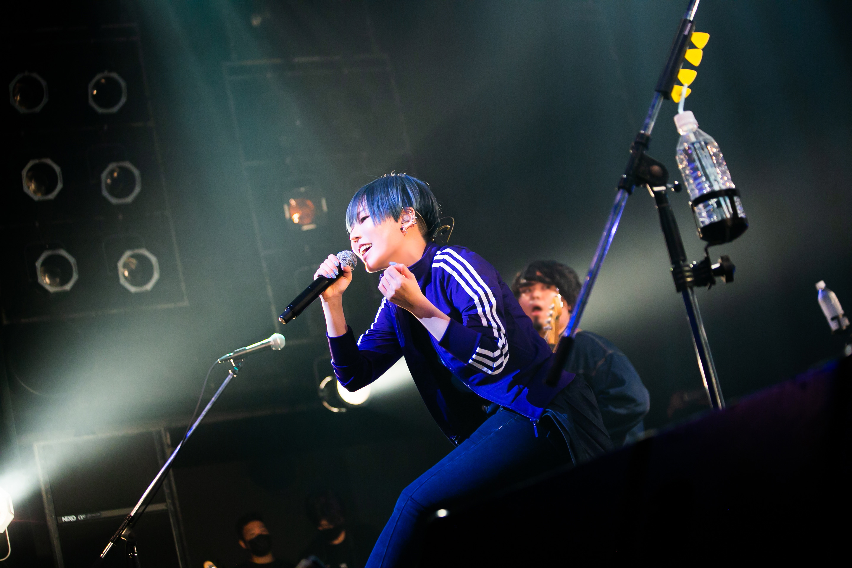 次に登場したのは、ポルカドットスティングレイ。この日のライブが約2年振りの有観客ライブとのことで、ステージに登場するとすぐにフロアに向かって手を振った雫(Vo/Gt)はとても嬉しそうだった。そうしたポジティブなエネルギーを「トゲめくスピカ」の清涼感と疾走感のあるメロディに託しつつ流麗に歌い上げると、ダンスチューン「FREE」を投下してフロアの熱をさらに上げていく。エジマハルシ(Gt)の軽妙なカッティングギターと、ウエムラユウキ(Ba)とミツヤスカズマ(Dr)が織りなす軽快なビート、雫の伸びやかなボーカルが合わさり、オーディエンスの足元を揺らす。