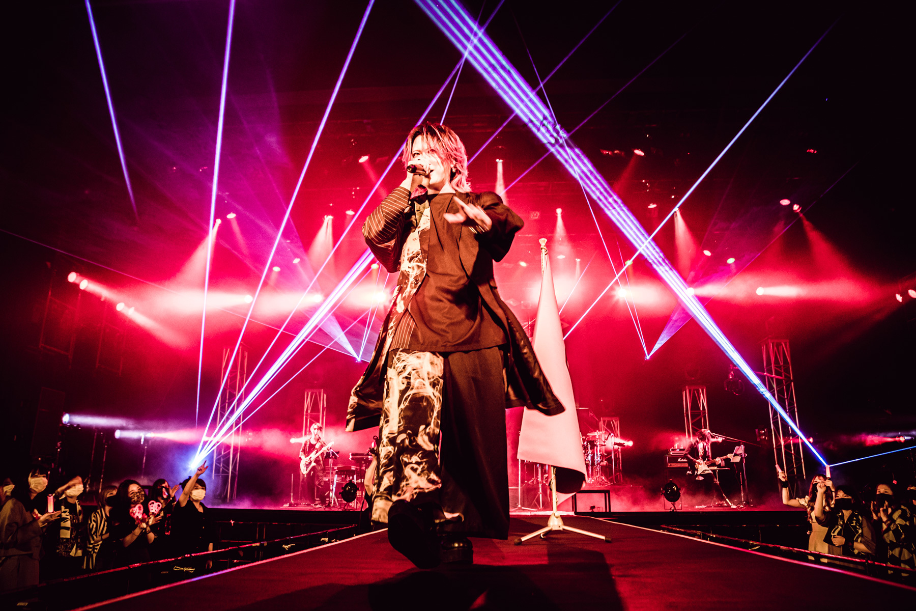 ライブでこの曲から始まったら鳥肌モノだなと期待していた「DOXA」から、ライブはスタート。『UNKNOWN PARADOX』の1曲目を飾る、ドラマティックなナンバーだ。バンドメンバーが生み出す骨太なインストゥルメンタルにあらきの歌声が重なり、ライブタイトルが大きく映し出された紗幕の向こうにその姿を確認した瞬間、会場の熱も一気に上がる。長引くコロナ禍にあって、まだ“ののめけ(声高に叫べ、という意味の古語)”というフレーズに大声で応えられないオーディエンスだが、あらきのイメージカラーである赤色が光るペンライトを振ったり、身体を揺らしたり。気持ちはひとつだ。
