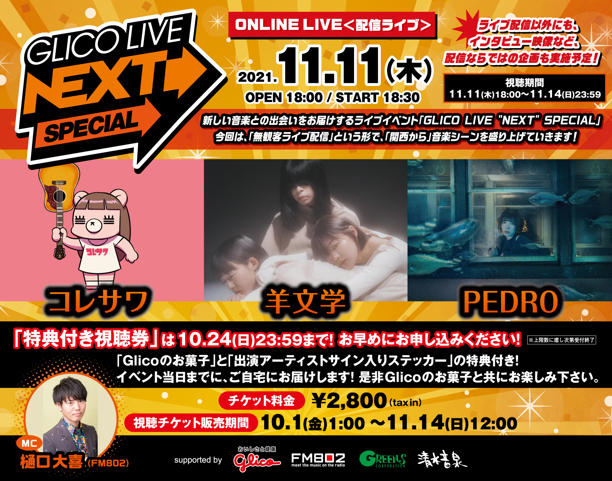 大阪のラジオ局FM802が11月11日(木)に、ライブイベント『GLICO LIVE “NEXT”』をStreaming+にてライブ配信で開催し、コレサワ、PEDRO、羊文学の3組が出演する。