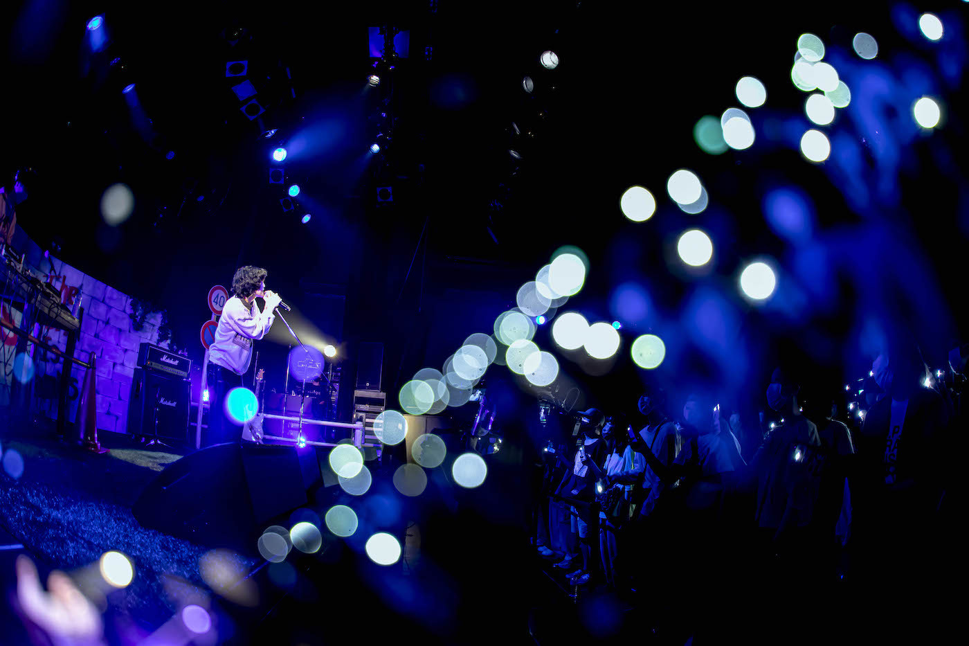 “ラッパーでもバンドマンでもない”Momは、歌との垣根なく巧みにラップもすれば、ギターもプレイする。バウンシーなビートをメロディアスなフローで乗りこなす「Momのデイキャッチ」では手にしたギターで歪んだサウンドをかき鳴らし、続く「あかるいみらい」ではマイク一本で、明るくない今の時代の日々の葛藤を皮肉交じりに描き出し、ステージ上でもジャンルや形態にとらわれない自由な音楽性を謳歌する。ライブにおいては会場のスピーカーから爆音で鳴らされる自作トラックの立体的なサウンドと共に、曲ごとにヒップホップに歩み寄ってみたり、ロックに歩み寄ってみたりと、表現の切り替えの巧みさ、柔軟さが際立っていた。