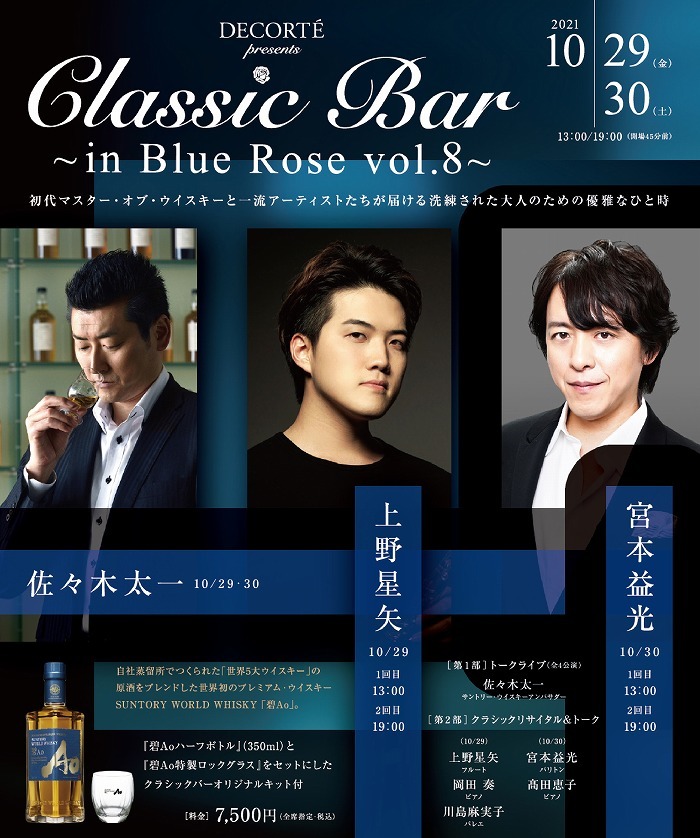 お酒と音楽のマリアージュを愉しむ大人のバータイム『Classic Bar~in Blue Rose~』。上質なお酒を嗜みながら酒類のスペシャリストとトップアーティストたちによるトークと演奏を、クラシック音楽の殿堂サントリーホールのブルーローズ(小ホール)で愉しむという一流づくしの何とも贅沢な公演。そのコンセプトが毎回人気を集め、2021年10月29日(金)・30日(土)に8回目の開催を迎える。