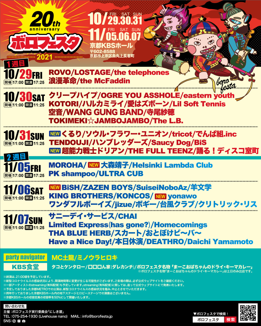 今年20周年を迎える京都の音楽フェス『ボロフェスタ2021 ~20th anniversary~』の第4弾出演アーティストが発表された。
