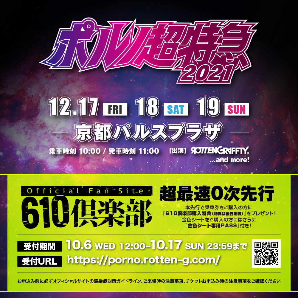 出演アーティスト等は追って発表となるが、本日・10月6日(水)より610倶楽部ではチケットの“超最速0次先行”受付がスタートした。同時に、参加に当たっての新型コロナウィルス感染症対策ガイドラインも発表されている。