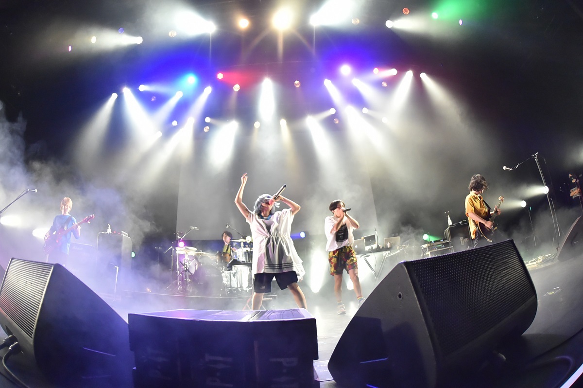 神激の3人が姿を消した後も、ステージはその勢いをキープしたまま和テイストな「ヒメサマスピリッツ」へ。この曲ではバジルが扇子を手に持ち、それを華麗に振ってフロアをアゲて、観客たちをましょ隊のペースへどんどん巻き込んでいく。トランシーなイントロからヘヴィロックへと展開してく「完全無敵のぶっとバスターX」、さらに激しいギターリフにgariのスクリーモ、バジルのクリーンな歌パートのコントラストで魅了していく「願い星」を響かせ、最後はステージを駆け巡りながら「冒険の書1」で楽しく、気持ちよく、盛大に大爆発。トップバッターらしく、フロアいっぱいに熱気を広げたところで次へバトンタッチした。