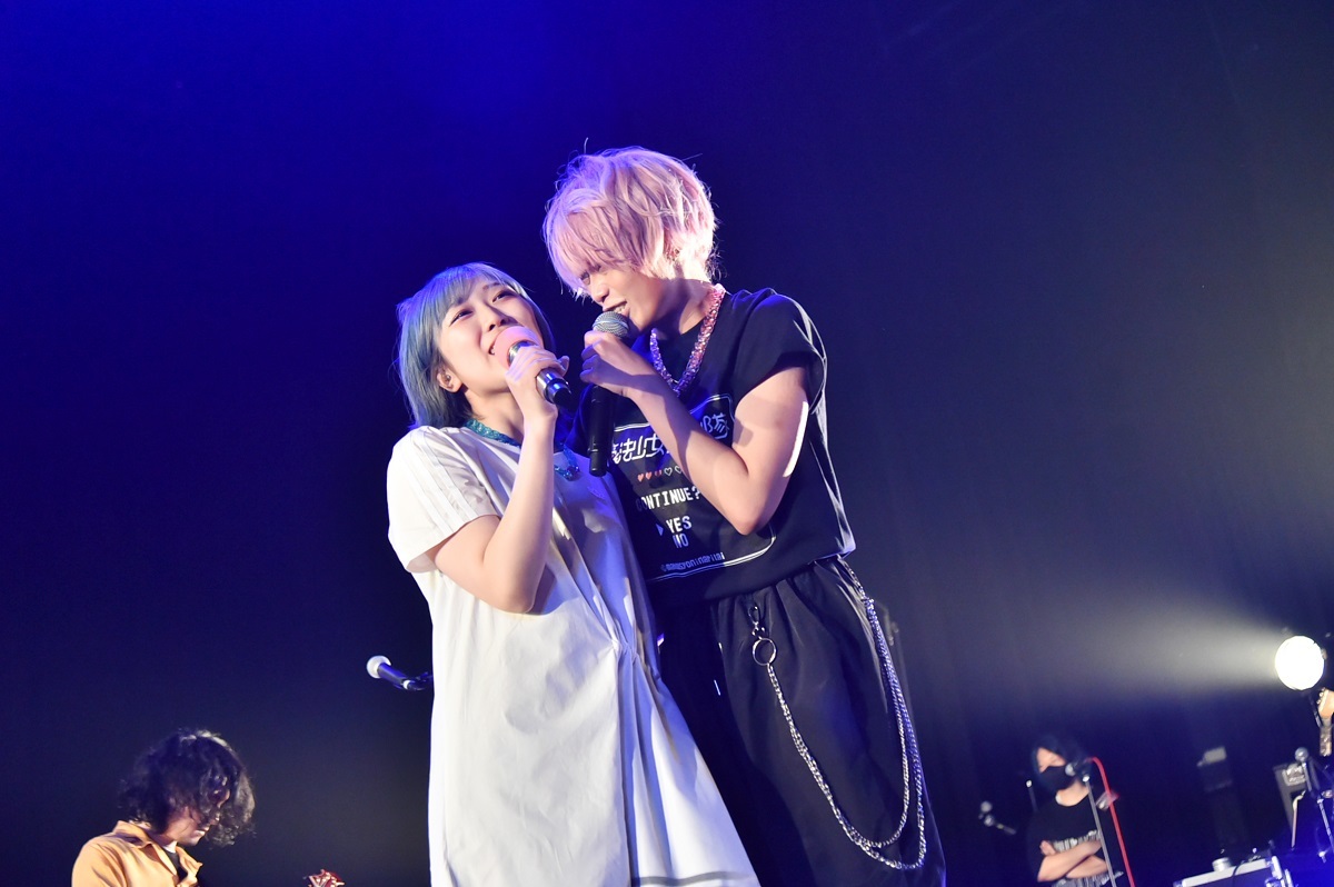 ステージ後方にRPG風の映像が流れ、サポートメンバーとともにgariが「どうも初めまして!」と溌剌と挨拶をしながら現れ、オーディエンスにクラップを求める。そこにバジルが登場し、ライブは「NEW ME」でスタートをきった。オートチューンなしのバジルの歌声、サビでバジルのオクターブ下をgariが歌ったかと思えば、間奏ではギターの速弾きが飛び出すなど、ましょ隊の新章の始まりとなったこの曲で、冒頭からNEWな自分たちを存分に見せつけていく。