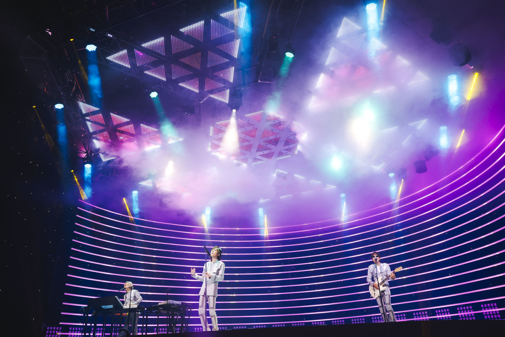 生のライブ空間ではないが、モニターの中でステージに立つ3人の姿も実に絵になっている。画面からも彼らのリアルな存在感が伝わってくるのだ。ステージに立っているのは3人のみ。下手の小室はコの字型に配置されたキーボードに囲まれている。「水を得た魚」になぞらえて、「シンセサイザーを得た小室」と表現したくなるくらい、なじんでいる。中央の宇都宮はマイクスタンドの前に立っている。木根は上手でギターを弾いている。それぞれがいるべき場所にいるという安心感がある。三角形のフォルムがあまりにも自然なのは約38年の歴史があるからだろう。サポートメンバーが参加しない編成だからこそ、TM NETWORKというトライアングルの持っている独自性や3人の関係性が際立っていく。