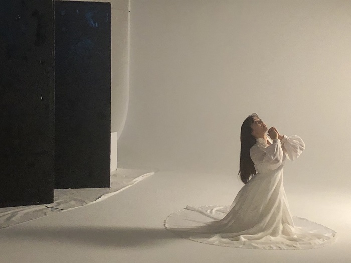 ビジュアル撮影最終日。最初にその姿を現したのはユリア役の平原綾香だ。ゆるく上品にウェーブのかかった長い黒髪が全身白のドレスに映え、揺れるまつげも美しい。首周りを優しく包むレースの飾り、透け感のある袖、長く引かれた裾。全身のラインを完璧にするために選ばれた白いハイヒールで颯爽とカメラの前へ立ったその表情には、早くもユリアの慈愛と意思の強さが宿っている。スタッフからも「しっかりと気持ちが入っていますね」との感想が。