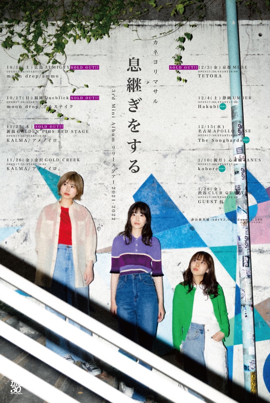 大阪発3ピースガールズロックバンド・カネヨリマサルが、10月16日より開催する『カネヨリマサル 3rd Mini Album リリースツアー 2021-2022 “息継ぎをする”』の追加ゲストが解禁となった。