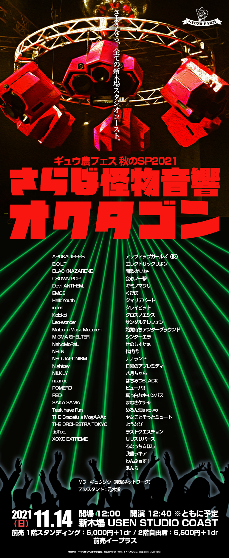 ギュウゾウ(電撃ネットワーク)が主催するアイドルイベント『ギュウ農フェス秋のSP2021 -さらば怪物音響オクタゴン-』が、11月14日に東京・新木場STUDIO COASTで行われる。