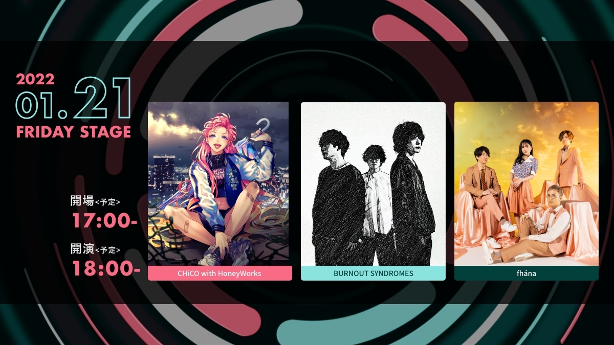 初日の1月21日(金)「FRIDAY STAGE」には、CHiCO with HoneyWorks、BURNOUT SYNDROMES、fhánaが出演。