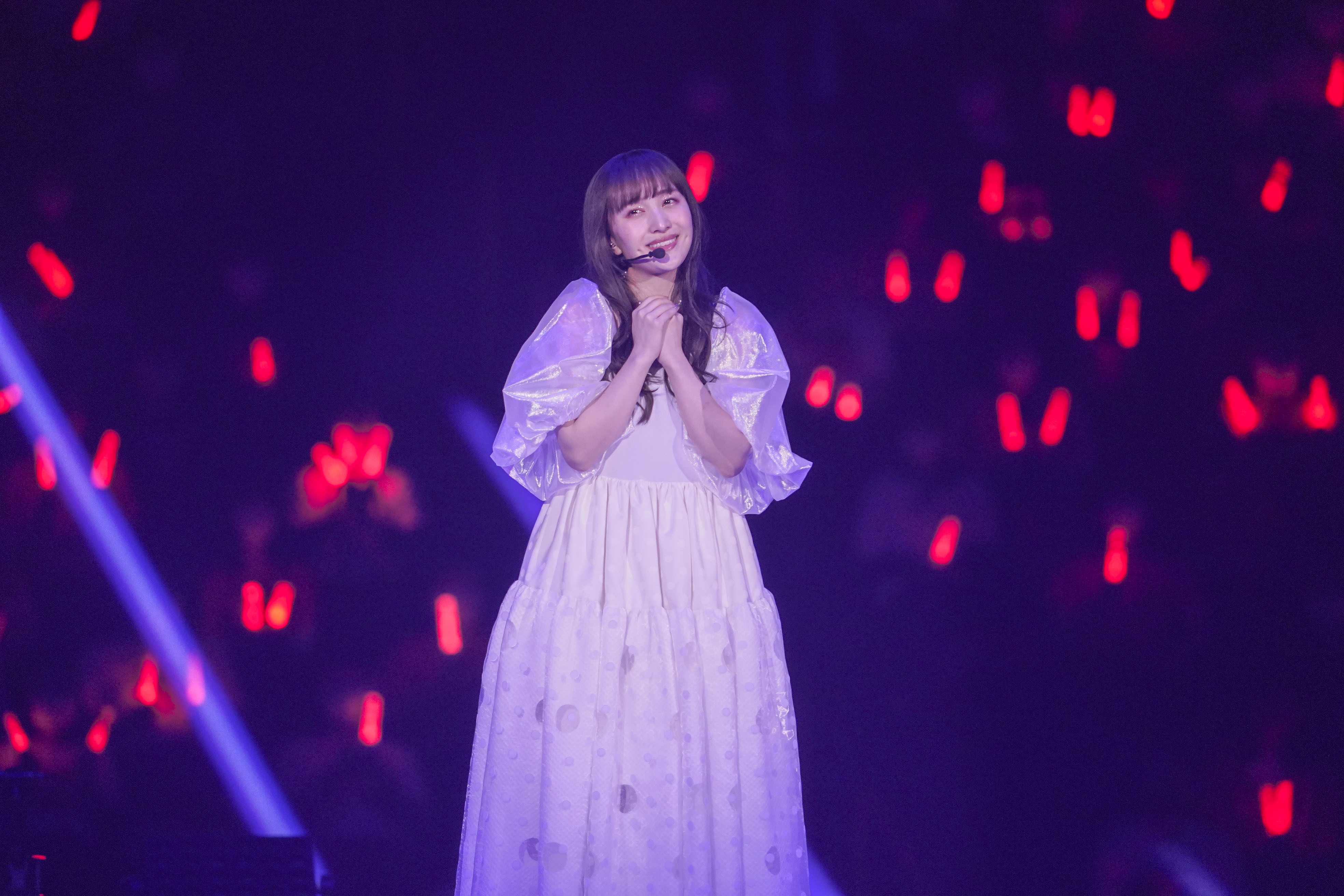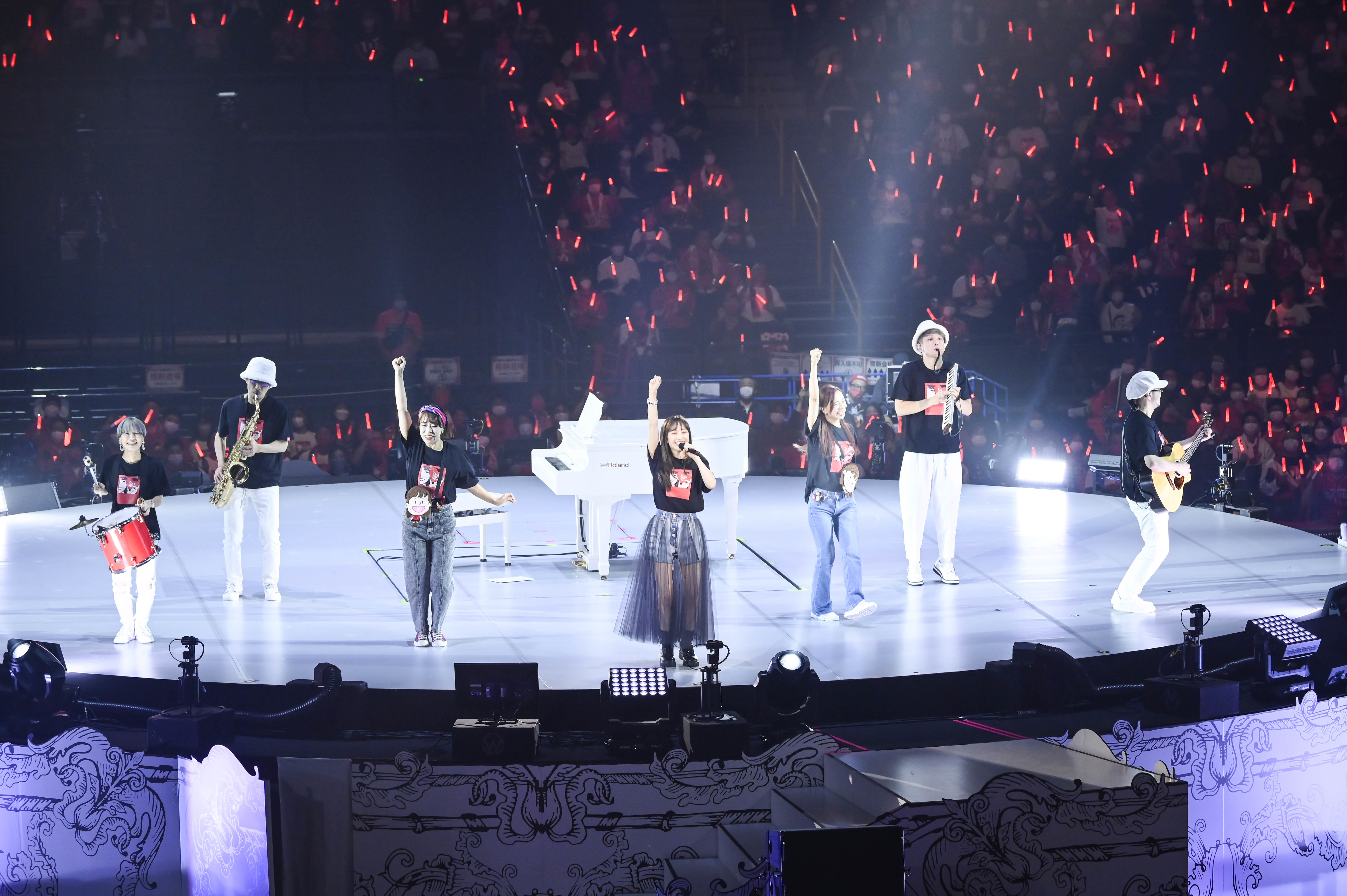 「続いてがラストの曲となります!声は出せないので、この曲は一緒に踊ってください!簡単な振り付けになってるのでみんなでね!」と会場を煽り「渚のラララ」をバンドメンバー、ダンサーとともにポップにパフォーマンスし笑顔満開の世界へ導いてアンコールパートを終えた。
