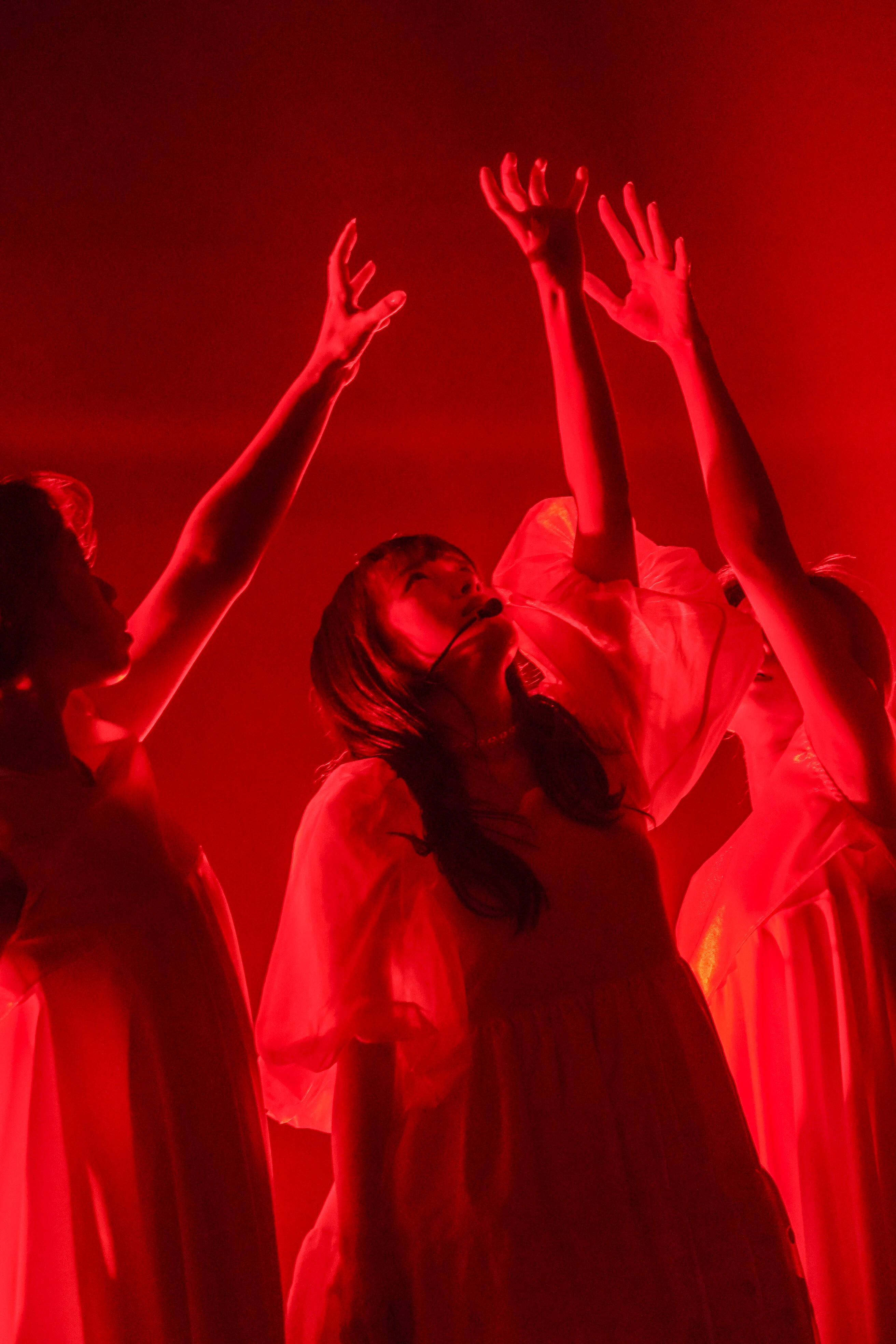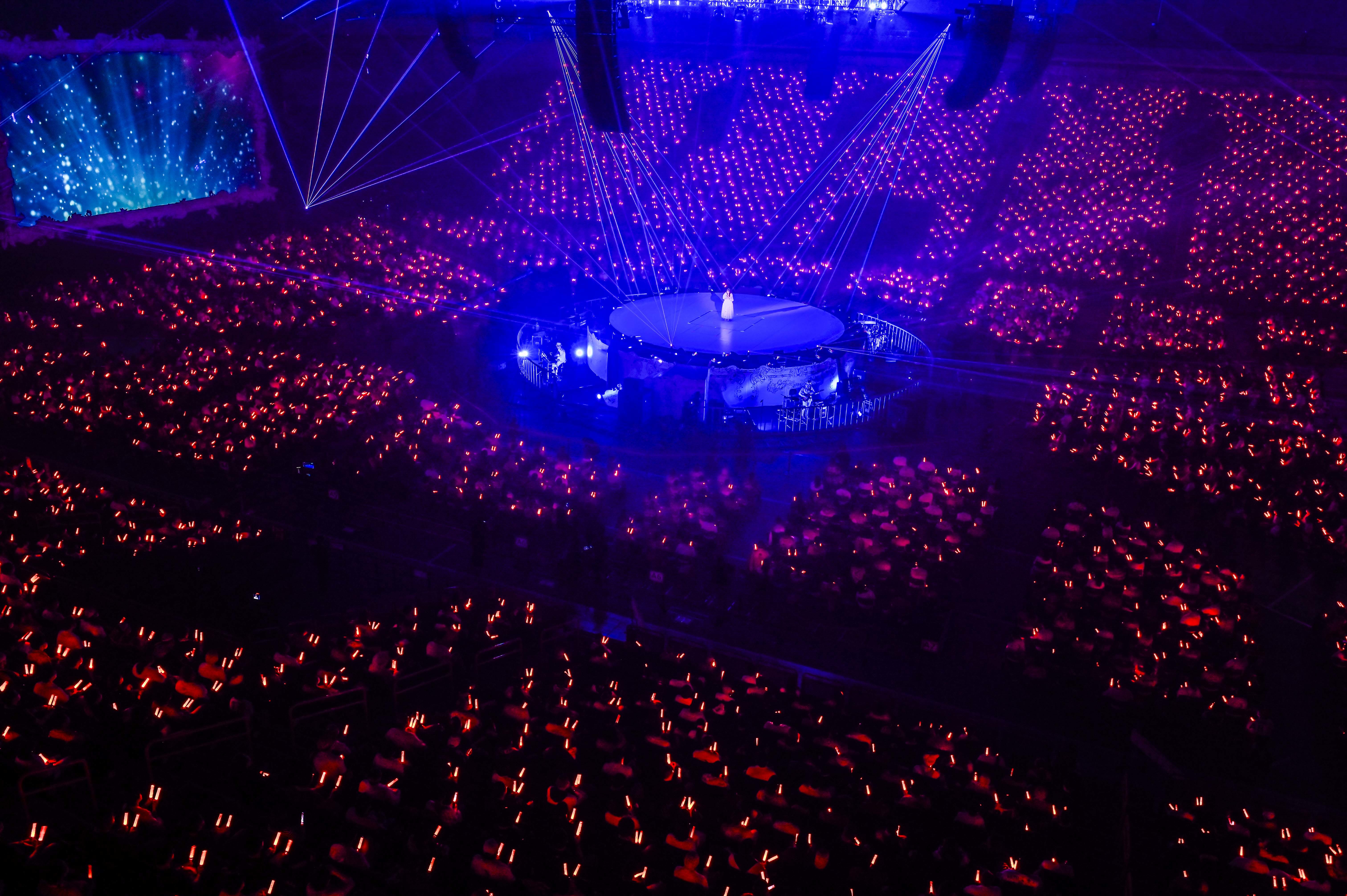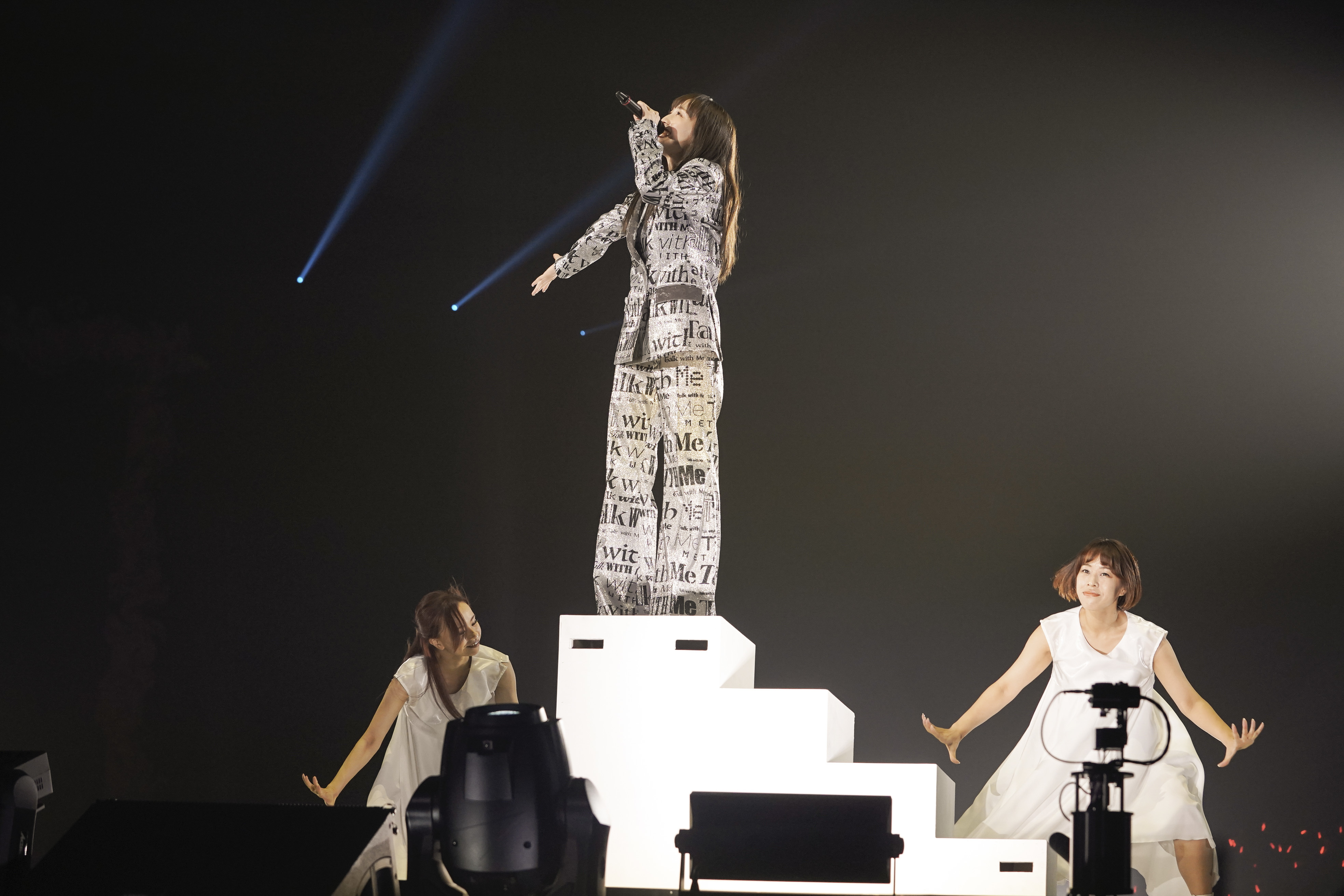一度ステージを後にすると、今回のライブタイトルである「Talk With Me」の文字が散りばめられたセットアップのパンツスーツ姿の衣装へ着替え再びステージへ。アメリカのハードロックバンドであるKISSとコラボレーションしたロックナンバー「夢の浮世に咲いてみな」をダンスとレーザーのシンクロを用いながらの高度な演出とリンクしたパフォーマンスで会場の熱気を一気にあげ、間髪なく “復活・再生”というテーマを持つオリエンタル調のEDMである「リバイバル」をダンサーと二人で激しいダンスを織り交ぜながらの力強いパフォーマンスで会場を魅了した。