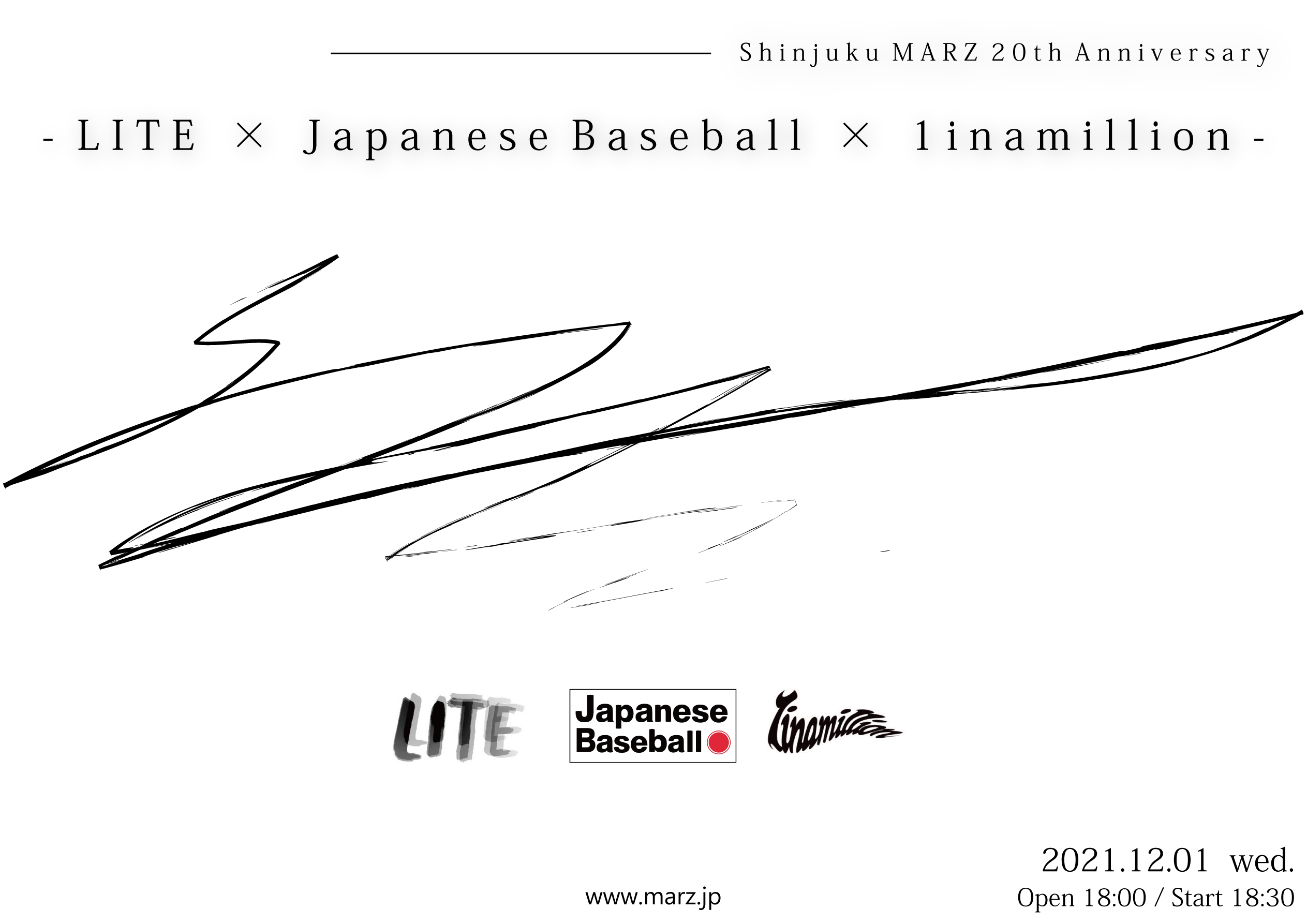 12月10日で20周年を迎えるライブハウス新宿MARZ。20周年イベントとして、LITE、Japanese Baseball、1inamillionというインストゥルメンタルバンド3組が共演。アニバーサリー月間の初日となる12月1日に開催されることが発表された。