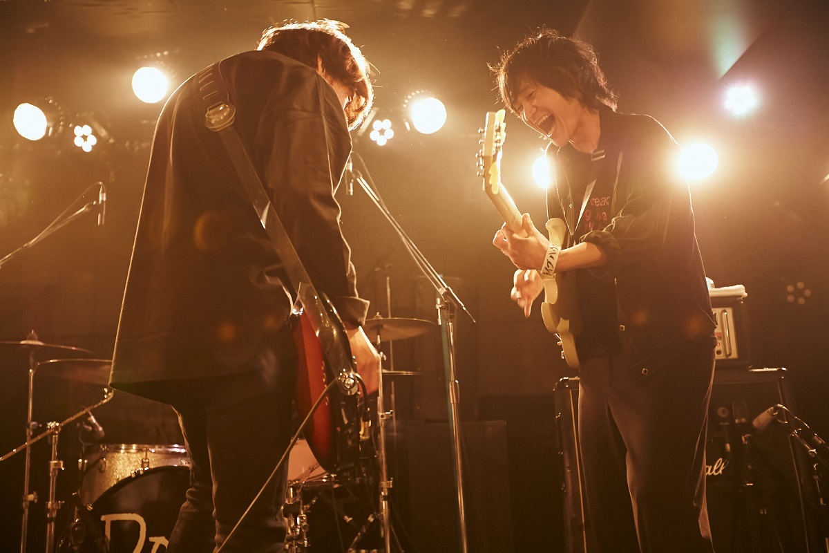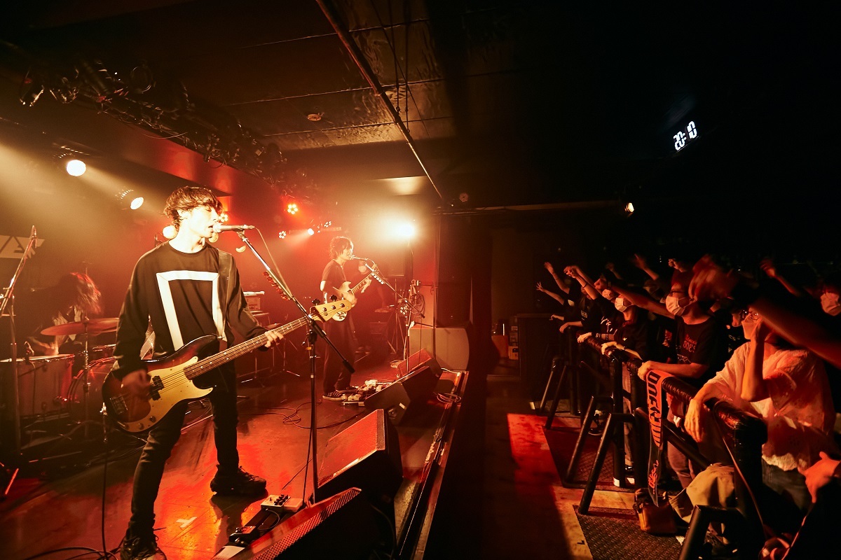 ゆえに、後半戦に突入しそれまで後ろで一本に束ねていた髪を振りほどいたケーサクは、みずから叩き出すビートで終始オーディエンスを引っ張り、いつになく飛び跳ねながらベースを弾き倒しながらも、イントロや曲間でハンドクラップを率先していたヤス。そして、この日「身体を使って楽しもう」と何度も呼びかけていたワタルしかり、初めてライブハウスに来たという人にも、フロアでもみくちゃになっていたかつてのライブを知っている人間にも、こんな形で一緒に楽しむこともできるぜ、とコロナ禍でのロックバンドの楽しみ方を提示していく3人の姿がなんとも頼もしくもあった。