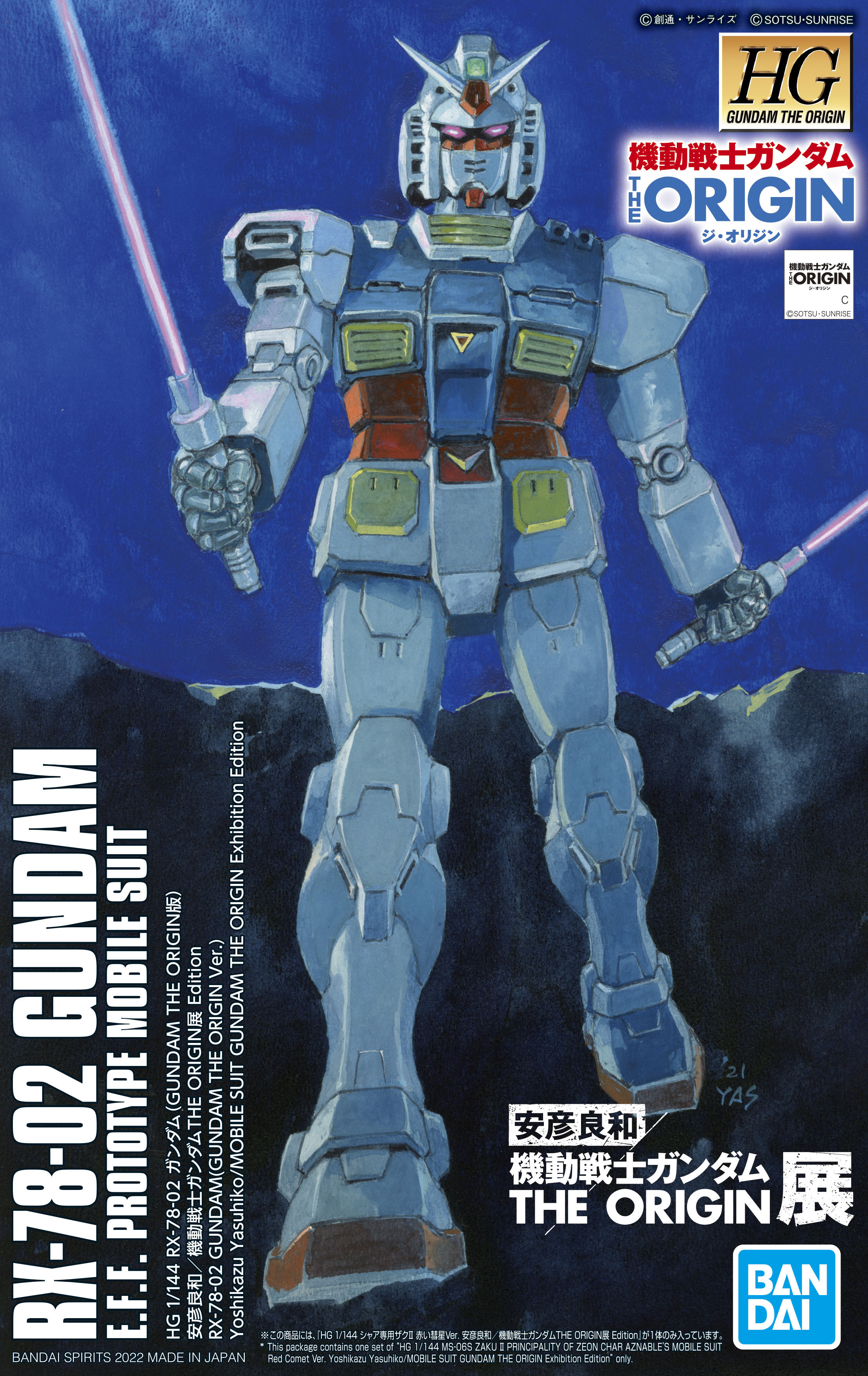 今回公開となったガンプラは「HG 1/144 RX-78-02 ガンダム」と「HG 1/144 MS-06S シャア専用ザクII 赤い彗星Ver.」の二種。パッケージイラストは安彦良和が担当している。