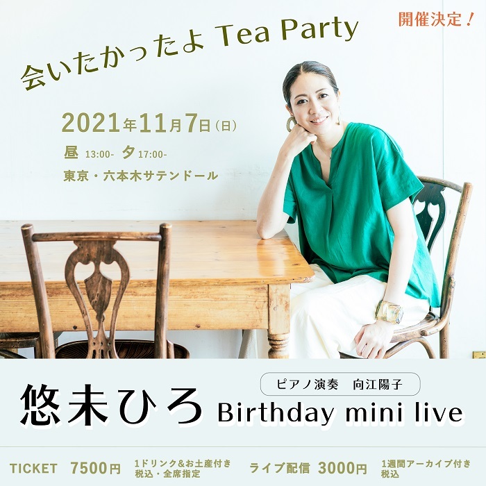 2021年11月7日(日)六本木サテンドールにて、『悠未ひろ Birthday mini live 〜会いたかったよ Tea Party〜』が開催されることがわかった。