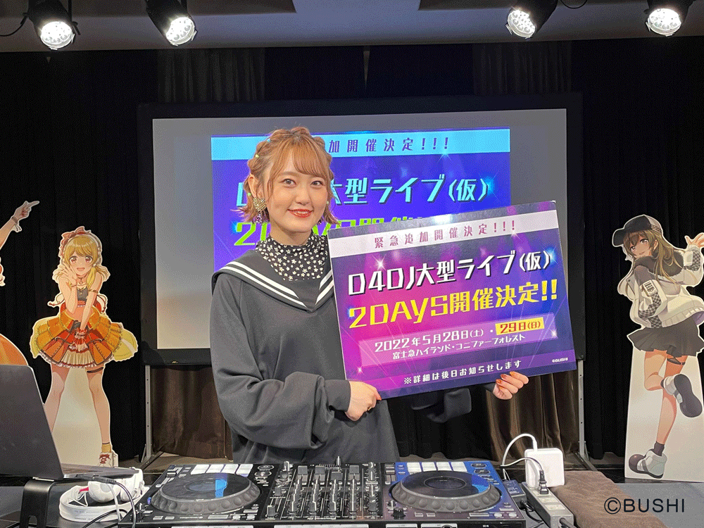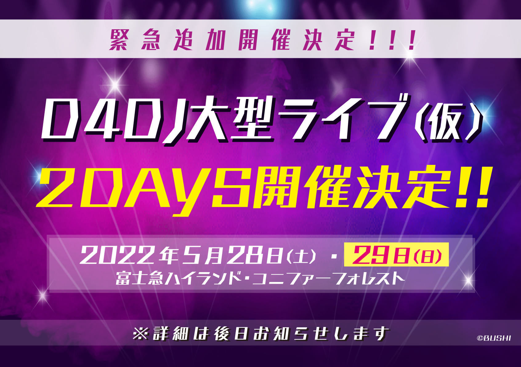ブシロード発、DJをテーマにしたメディアミックスプロジェクト『D4DJ』。本コンテンツの大型ライブが2022年5月28日–29日の2日間、富士急ハイランド・コニファーフォレストで開催されることが決定した。