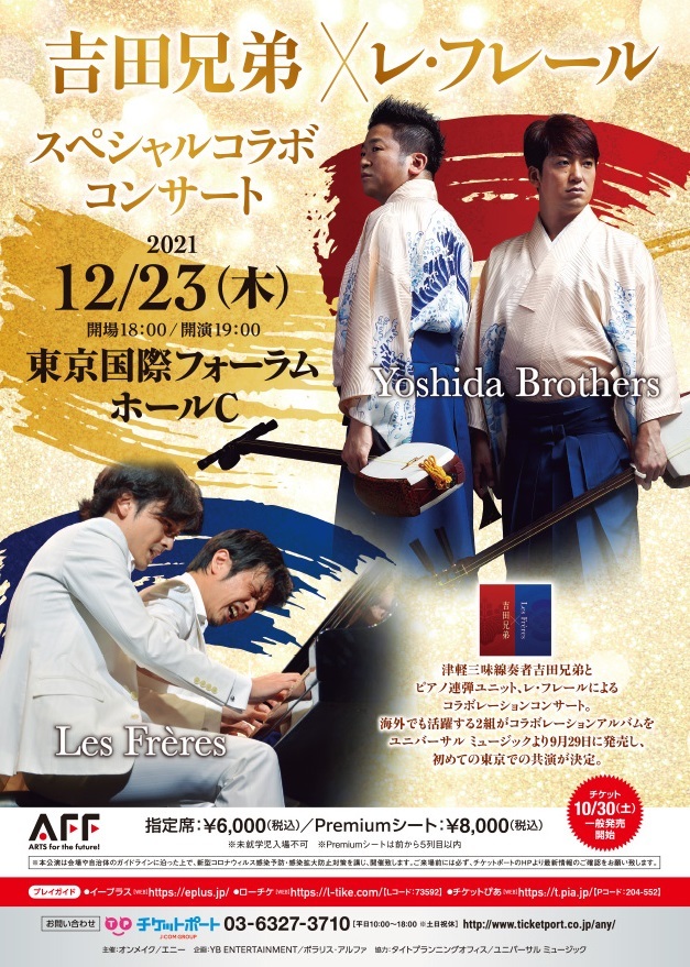 日本の伝統芸能に旋風を巻き起こした津軽三味線奏者 吉田兄弟(吉田良一郎・吉田健一)。そして、「キャトルマンスタイル」で一世を風靡したピアノ連弾 レ・フレール(斎藤守也・斎藤圭土)。この人気の二組の兄弟によるコラボレーション・アルバム『吉田兄弟×Les Frères』が2021年9月にリリースされた。そして、12月23日(木)には久々の東京公演となる『スペシャルコラボコンサート』を東京国際フォーラムで開催する。