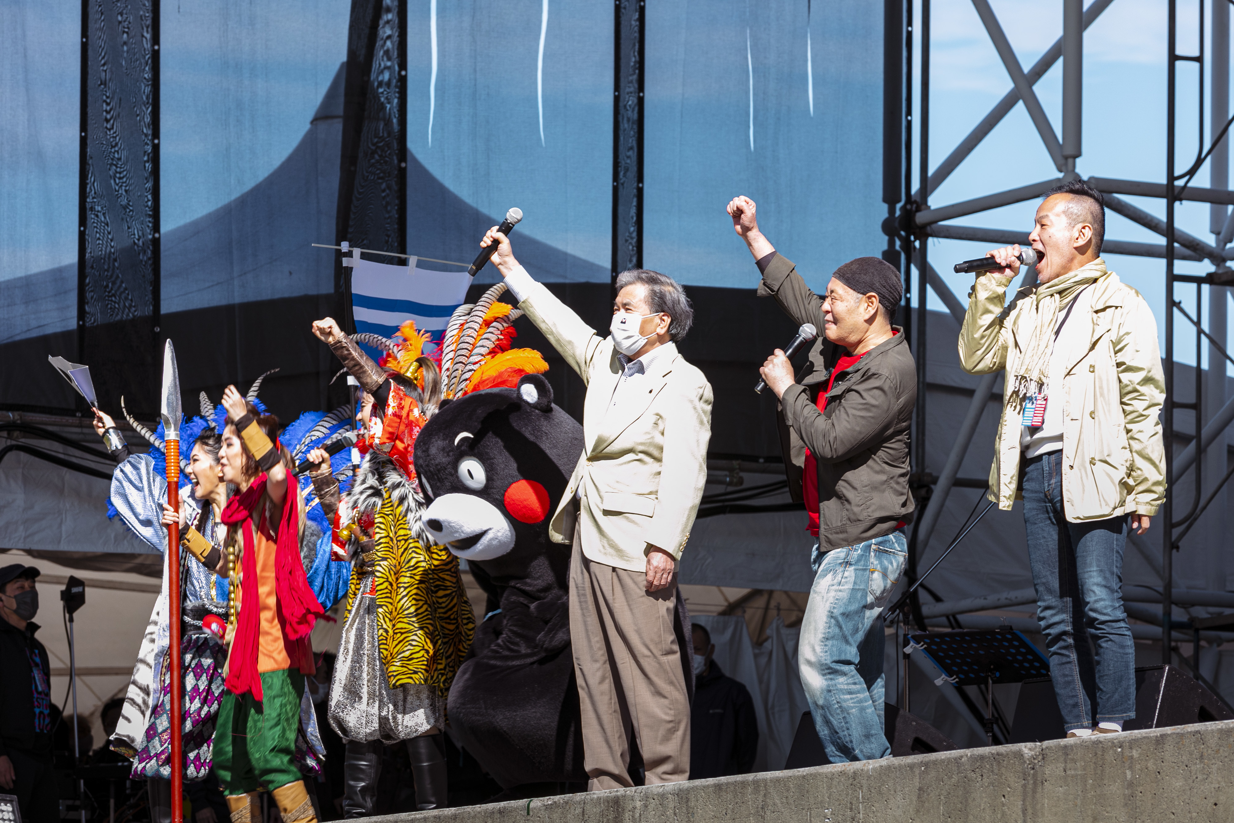 9時に始まったサイプレス上野のDJタイムに続いた開会宣言は、泉谷しげると熊本県知事、そして、地元の歌劇団のメンバー、司会は、2011年から熊本に戻って活動しているDJのスマイリー・原島。「何で知事が出てくるんだ」という声はない。