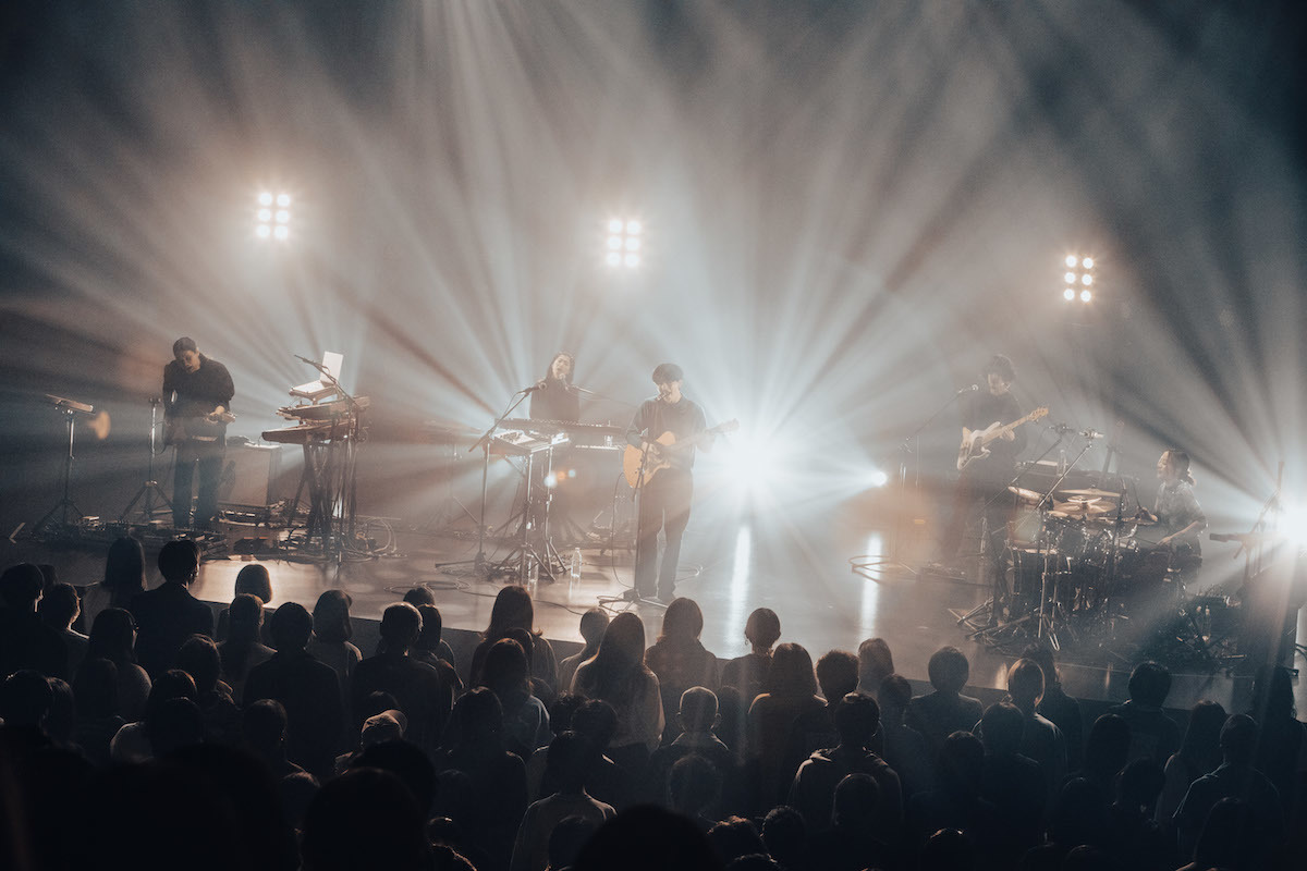 ブライトな「Summer Time Magic」や「if」。様々な時代からの選曲にも何ら違和感はない。冒頭の3曲は福永の歌、そして山﨑康介(Gt)の繊細なギターのフレーズやリフが過不足なく聴こえたこと、一打入魂の大澤実音穂(Dr)による無駄のなさゆえにパッシヴなドラミング、さらに前回に引き続きサポートを務める雲丹亀卓人(Ba)の引き算のフレージング、シンセを含む鍵盤全般を操るちゃんMARIの、5人全員のバランスの良さに感銘を受けた。ステージ上のメンバーはもちろん、ライブPAチームとの練り上げを経た完成度の高さで「ライブの本質」を証明して見せたのだ。そう、この日、何度か福永は「この場所でしか聴こえない音、体感できない音があると思う」と語っていたが、その尽力は序盤から叶っていたのだ。