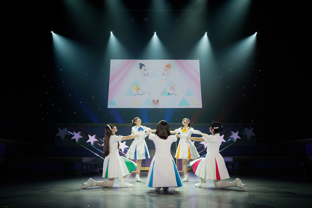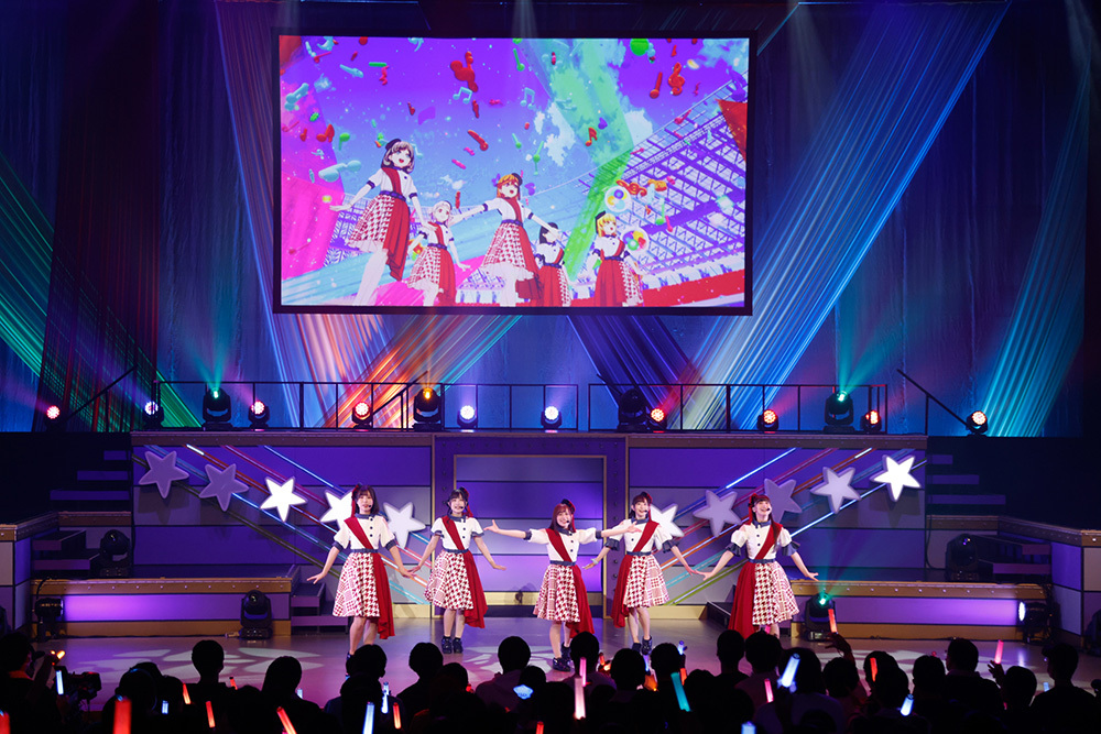 そんな岬のメッセージと共に始まったラストナンバーは、TVアニメED主題歌の「未来は風のように」。EDアニメが流れるスクリーン前に全員が集まって、メンバーの仕草を織り込みながら唄ってみせる。そしてステージ前に並んでの後半パートでは、イメージカラーのスカーフを手にしてコンサートライトを振るファンと共に振ったり、途中でCDジャケットのイラストのポーズを再現してみせたりなど、ファンには嬉しいパフォーマンスを織り交ぜて、最高の盛り上がりでライブを締めくくった。