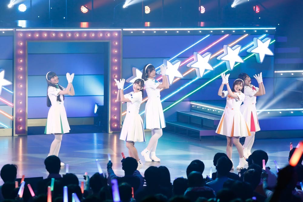 MC明けの1曲目は、TVアニメ第一話のクライマックスを飾った印象深いナンバー「未来予報ハレルヤ」。アニメではあふれ出る歌への想いを叫ぶように歌い始めたシーンを再現するように、伊達の伸びやかで力強いボーカルが場内に響き渡る。ステージ前面でセンターを務める伊達を中心に、段差のあるステージの左右に他の四人が陣取り、スクリーンのアニメPVに合わせたシンクロパフォーマンスと共に『ラブライブ!スーパースター!!』の始まりの曲を盛り上げていく。