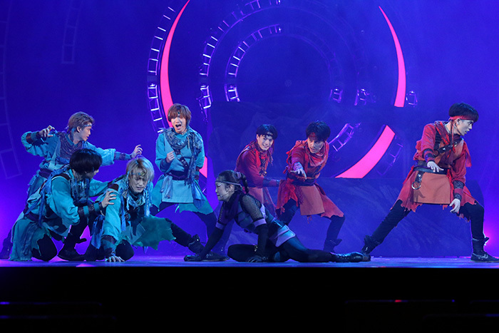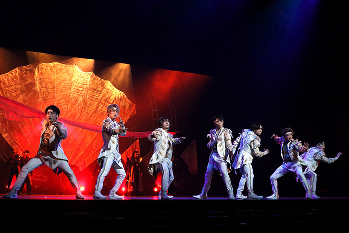 芝居パートに加え、赤忍者(宮近・松田・松倉)による電飾を使用したポップでクールなダンス、青忍者(中村・七五三掛・川島・吉澤)のセクシーなダンスなど、一人ひとりの魅力を味わえるパフォーマンスが満載。また、トランポリンを使用し、複数人でタイミングや高さをきっちり合わせるパフォーマンスのクオリティに驚かされた。セット自体はシンプルだが、トランポリンとプロジェクション、キャスト陣の身体能力の高さを組み合わせ、縦横無尽に走り回る忍者たちの身軽さや、幻想的な忍術を使った戦いを見せているのも印象的だ。