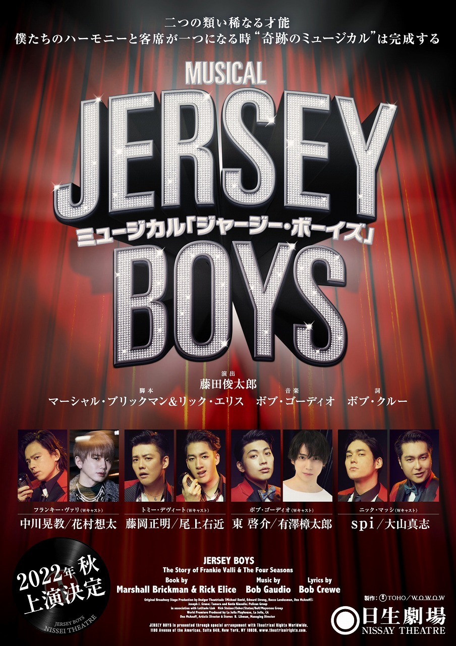 2022年秋、日生劇場でミュージカル『ジャージー・ボーイズ』が上演される。先日発表された、フランキー・ヴァリ役に続き、トミー・デヴィート役、ボブ・ゴーディオ役、ニック・マッシ役を務めるキャストが決定した。