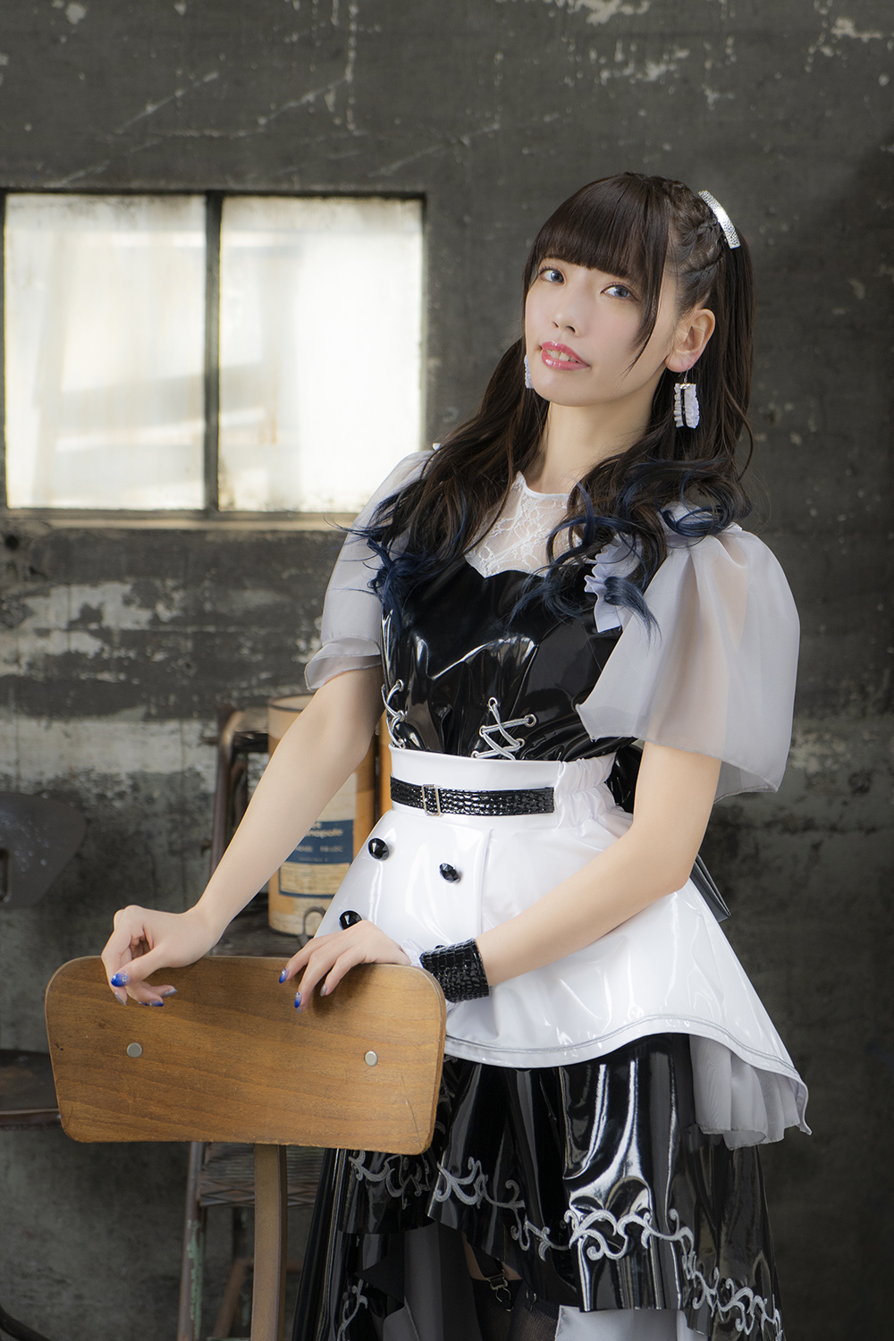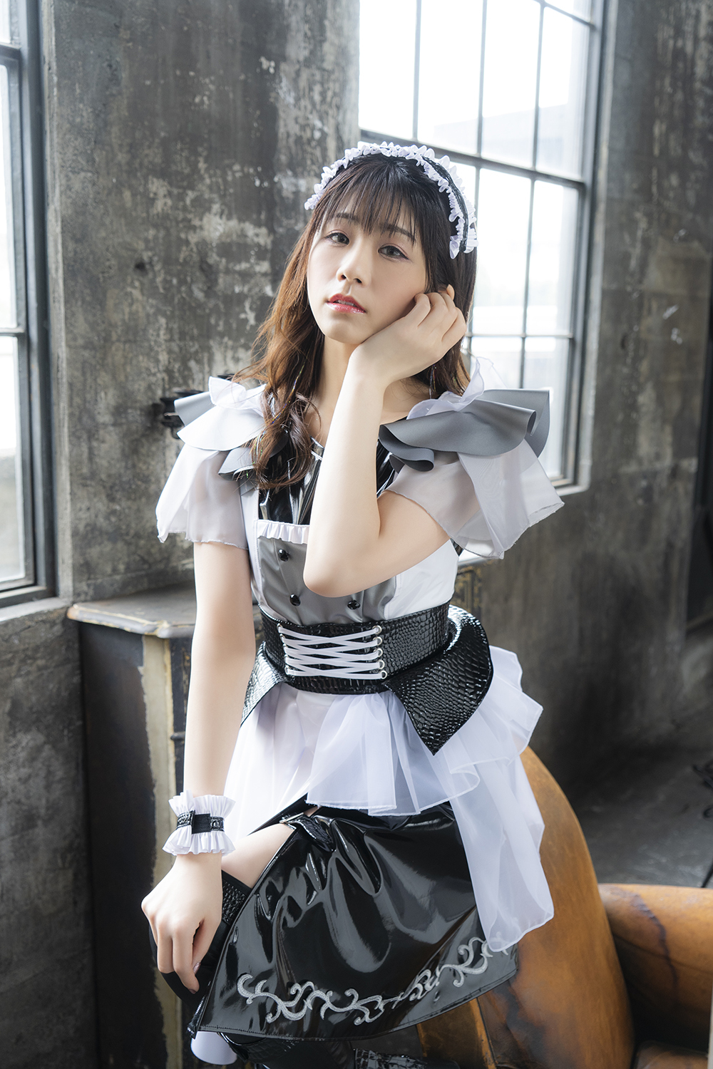 若歌:作品が、秋葉原が舞台というか。オタク文化をフィーチャーした作品だと聞いて。それでMia REGINAを選んでいただいた部分もあるのかなと思いました。秋葉原といえばなんだろうと考えたときに、やっぱりメイド喫茶?と、なり。作品的には荒廃した世界観だったりもするので、光沢のある素材などでカッコいい戦うメイドさん風にしました。