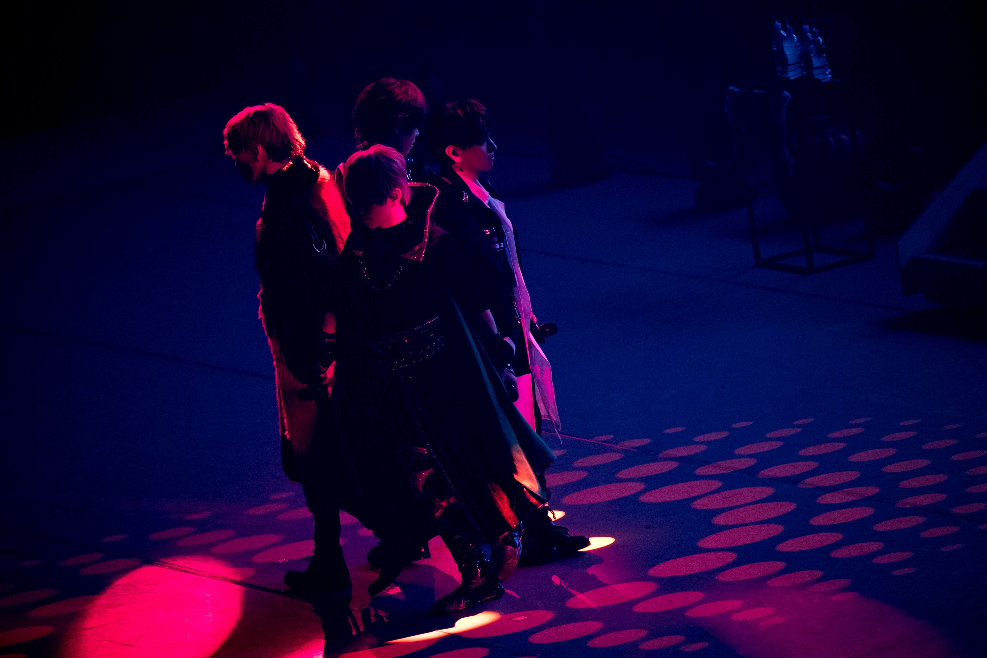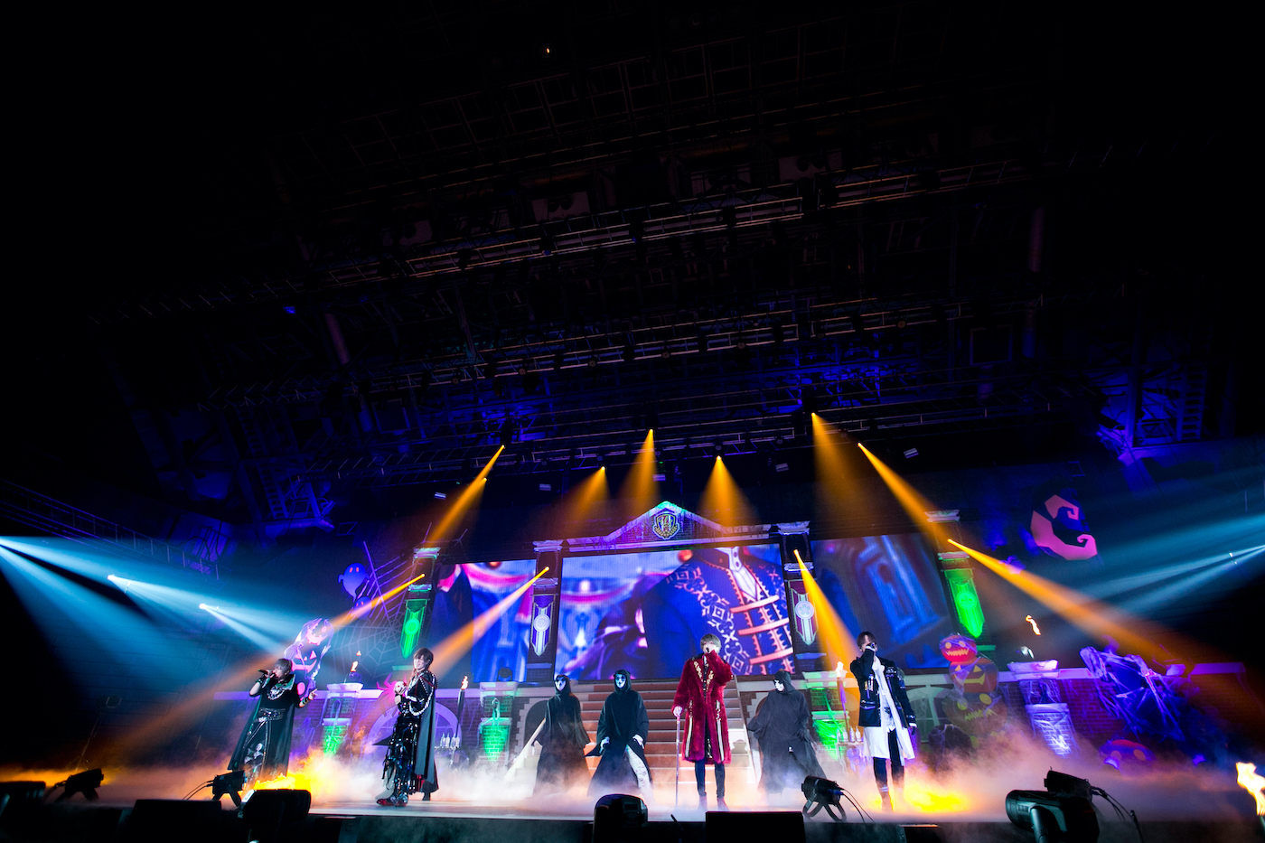 演出の火柱が勢いよく噴き上がり、4人それぞれの切れ味鋭いラップもクールにきまった「PIRATES A GO GO」。シャッフルリズムに4色のイケボが映えた「Ring」。「Shall we Dance?」と誘う「グリムメイカー」では、円形のステージをぐるぐると回るカメラが4人をしっかりキャッチ。続く「ハロウ!ゴーストシップ」では映像に歌詞がポップに踊って、ますます目が離せない。
