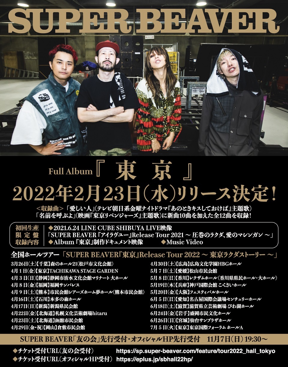 SUPER BEAVERが2022年2月23日(水)に、メジャー再契約第2弾フルアルバム『東京』をリリースし、3月26日(土)から全国ホールツアー『SUPER BEAVER『東京』Release Tour 2022 〜 東京ラクダストーリー 〜』を開催することを発表した。