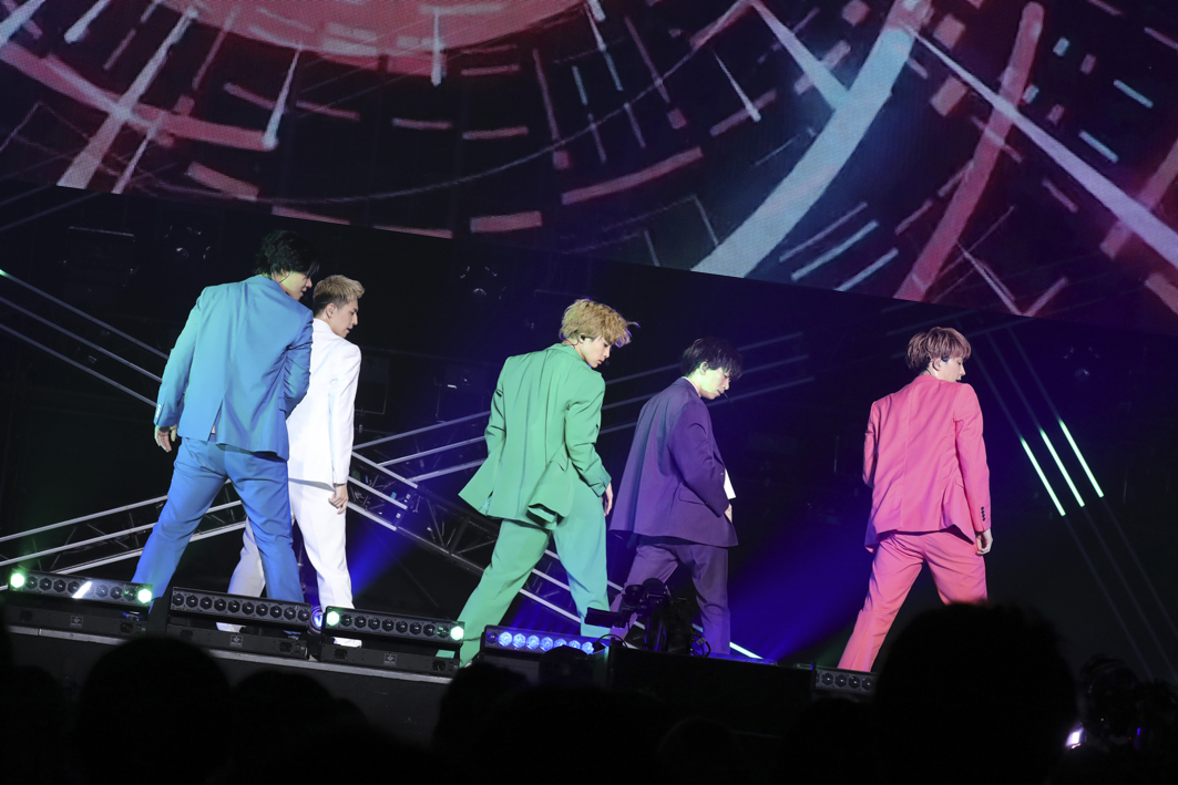そして、DAY2のトリを務めるのは超特急の5人。タクヤの「バズリズム〜!超特急がやってきたぜ!」とのMCを合図に、1曲目「SAY NO」がスタート。曲間ではこの日の出演者の名前をラップに乗せながら、あらためて感謝を伝える。青。紫、緑、赤に白とそれぞれのカラーに合わせた衣装で軽やかに舞い歌った。9月にリリースしたばかりのK-POP風の新曲「같이 가자 (カチカジャ)」では、英語・日本語・韓国語を交えた歌詞で会場を乗せていく。