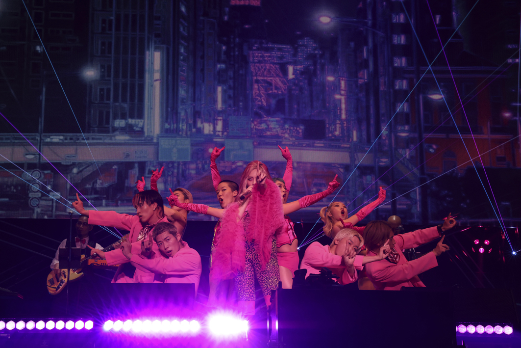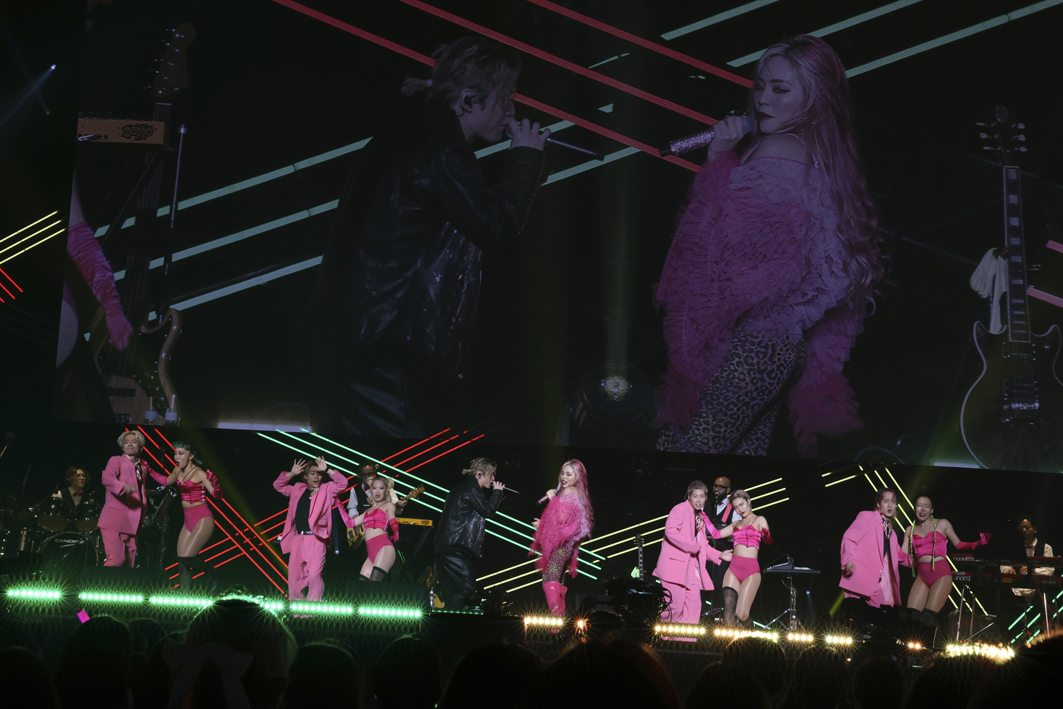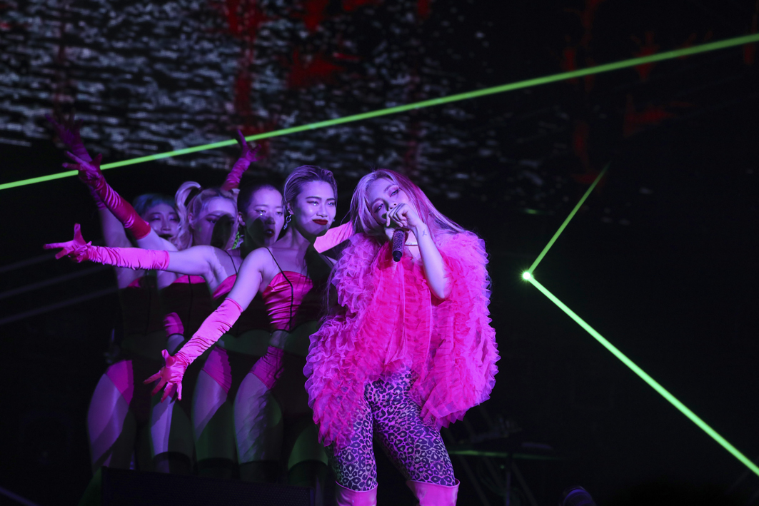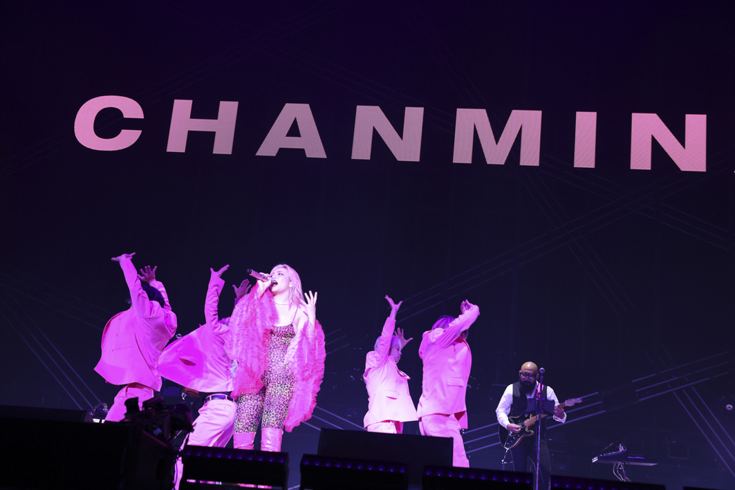 センター・スクリーンに、ショッキングピンクの文字で「CHANMINA」「と映し出されると、ステージ後方に構えた4人編成バンドがインストゥルメンタル演奏を始める。バンド演奏が徐々にテンポアップすると、豹柄のレオタードにピンクの羽根ショールを羽織り、ピンクのロング・ブーツを履いたド派手な佇まいのちゃんみなが登場。2曲目の「Angel」では、同じくピンクのコスチュームに身を包んだ男女8人のダンサーが入り、鮮やかなパフォーマンスを繰り広げる。そして、派手な見た目とは裏腹にMCでは優しく客席に語りかける。色とりどりにサイリウムの光で埋まった会場を眺めながら、「私のファンはピンクなんです」と話すと、場内のサイリウムが一斉にピンクに。これには彼女も「こころなしかピンクが多いような気がします」と感激した。