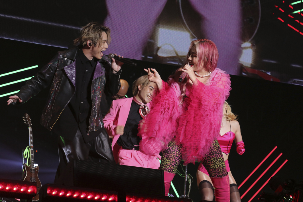 中盤、「今日はスペシャルなゲストが来てくれいてます!」とステージに招かれたのは、黒系のコスチュームをまとったSKY-HI。 8人のダンサーもジョインし、オリジナルのクリスマスチューン「Holy Moly Holy Night」を共に歌う。このサプライズには、オーディエンスも大喜び。ちゃんみなといえばオートチューン・ヴォイスの印象が強いが、「Angel」や「ダリア」では”素”の声で歌う。これが実にいい。何よりも、圧倒的な声量で艶やかに伸びる声は、ソウル/R&Bシンガーそのもの。35分のパフォーマンスは、彼女のもうひとつの一面を垣間見ることが出来るステージであった。