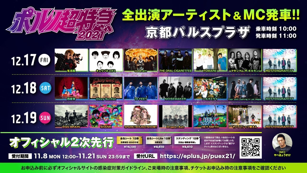 12月17日(金)、18日(土)、19日(日)に京都パルスプラザにて行われる、ROTTENGRAFFTYによる京都の冬フェス『ポルノ超特急2021』三日間の全出演アーティストとMCが一挙に発表された。