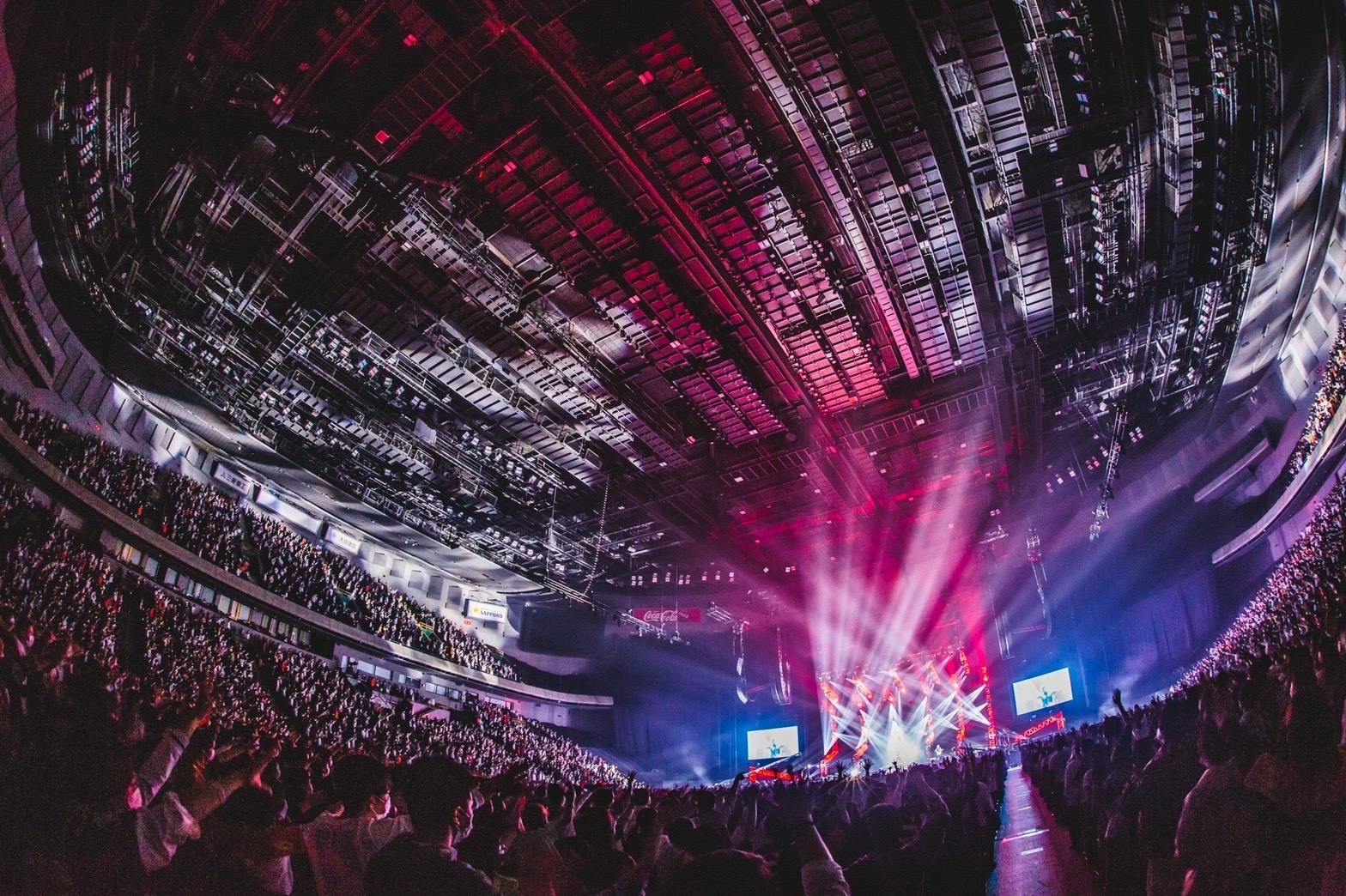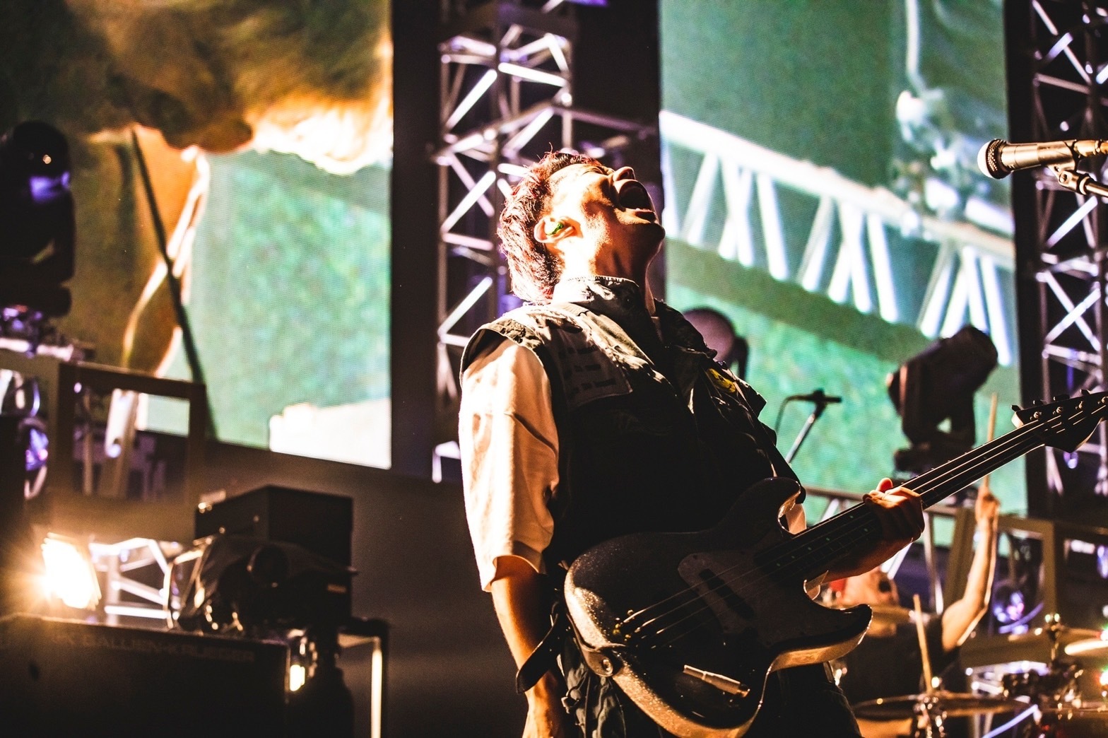 「昔はいちばん簡単だった「楽しい」という感情がいちばん難しい感情に変わってきて、悪いことのように感じてしまう風潮があると思う」と伝え、「この場所くらいはあなたの「楽しい」をしっかりと守りたい」と言葉を重ねたあと、中盤はアリーナならではのダイナミックな演出が目を引いた。炎が吹き上げ、サイケデリックな照明がステージを彩った「mob」では、強靭な横揺れのグルーヴで妖しげな空間を作り上げ、上杉の歪んだベースが口火を切った攻撃的なナンバー「正攻法」では、スモークが立ち込めるなか、柳沢が「過去最高を見せてくれ!」と不敵に叫んだ。藤原を中心に、柳沢と上杉が左右に広がり、渋谷が花道の先端に座り込んで歌った。そんなふうに、たまアリの広いステージを最大限に生かした「らしさ」から、唯一スクリーンに歌詞を映したバラード曲「愛しい人」へ。愛の向かう矛先を「自分」から「あなた」にシフトしていくこの2曲の流れはあまりにも美しかった。